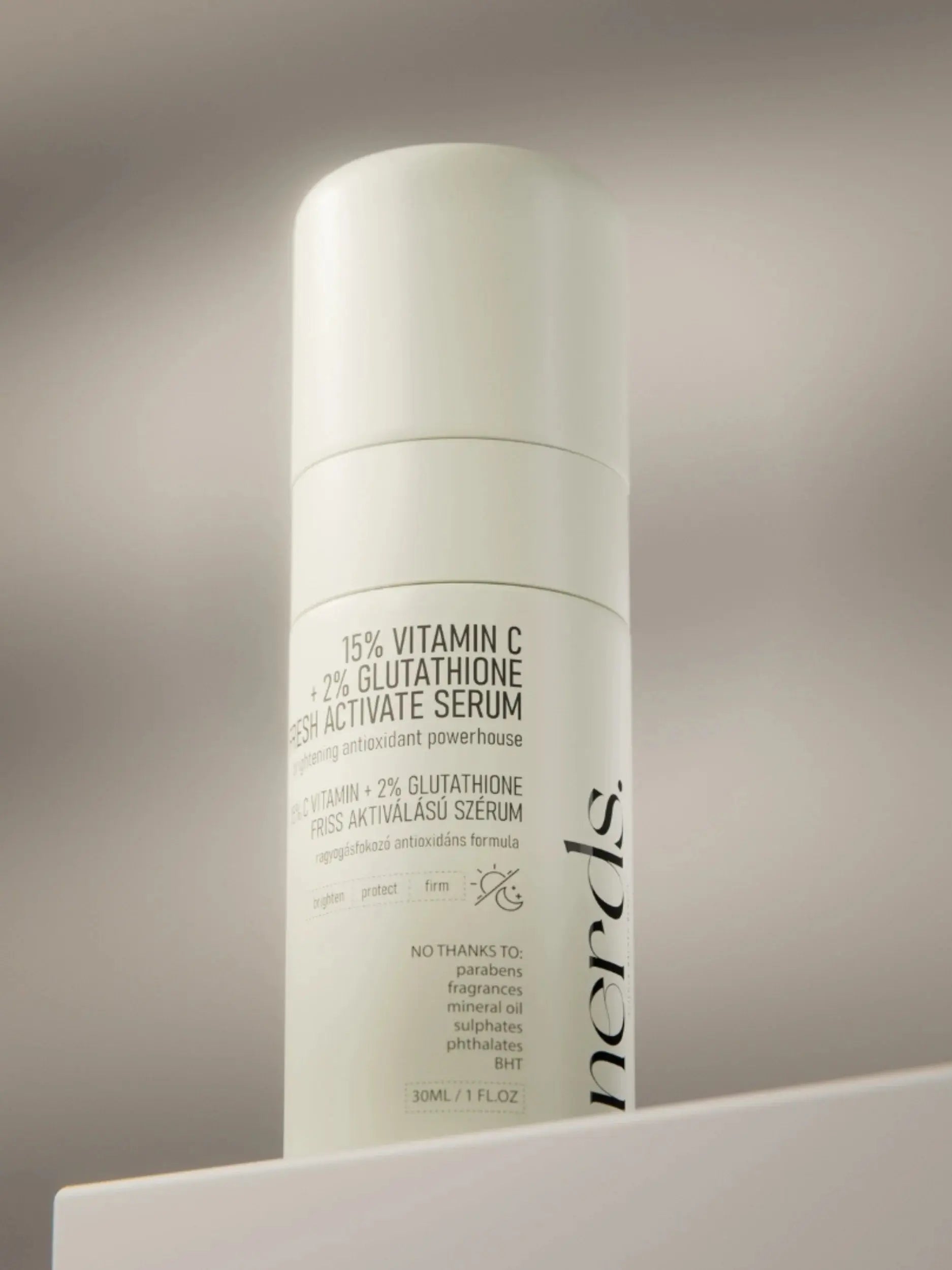 De NERDS 15% Vitamin C + 2% Glutathione Fresh Active Serum is een next generation antioxidant boost voor je huid. Met 15% L-Ascorbic Acid en 2% Glutathione combineert dit serum twee krachtige antioxidanten voor een zichtbaar helderdere, egalere en sterkere huid.
