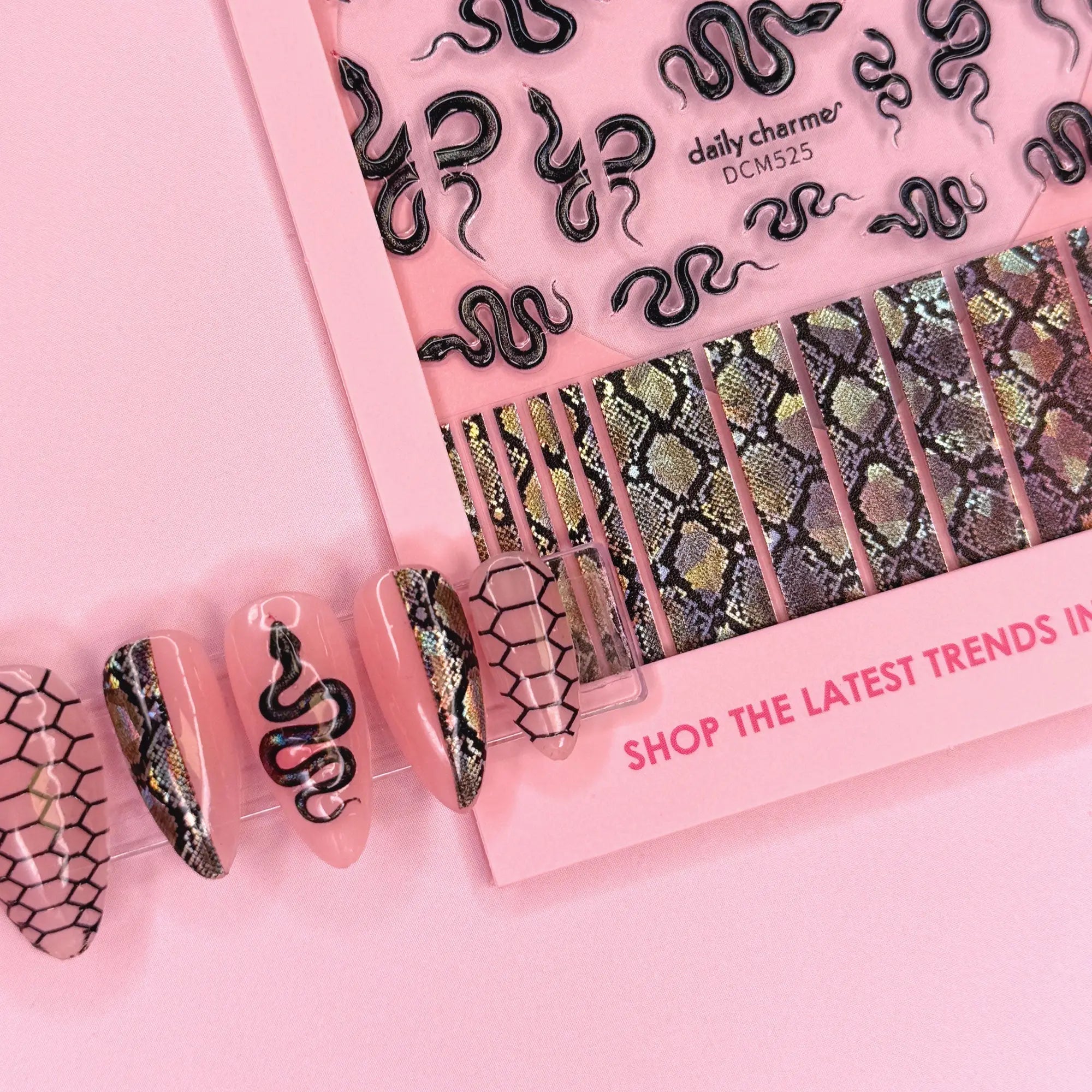 De Daily Charme 3D Embossed Nail Art Sticker Holo Sunbeam Snake is jouw must have voor een mani met attitude. Deze bold sticker sheet zit vol glanzende zwarte holografische slangen edgy snake prints en shiny snakeskin strips die je nagels een hypnotiserende high fashion vibe geven.