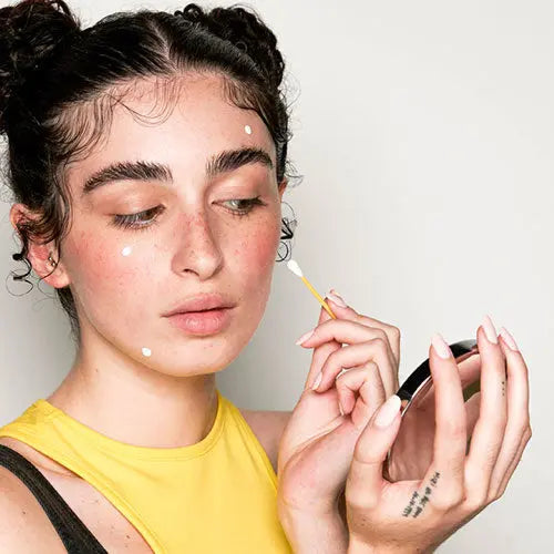 - Doop de applicator in de lotion totdat het de bodem raakt. Haal de applicator uit het flesje en tip rechtstreeks aan op het puistje. Zorg ervoor dat je niet met de applicator wrijft.