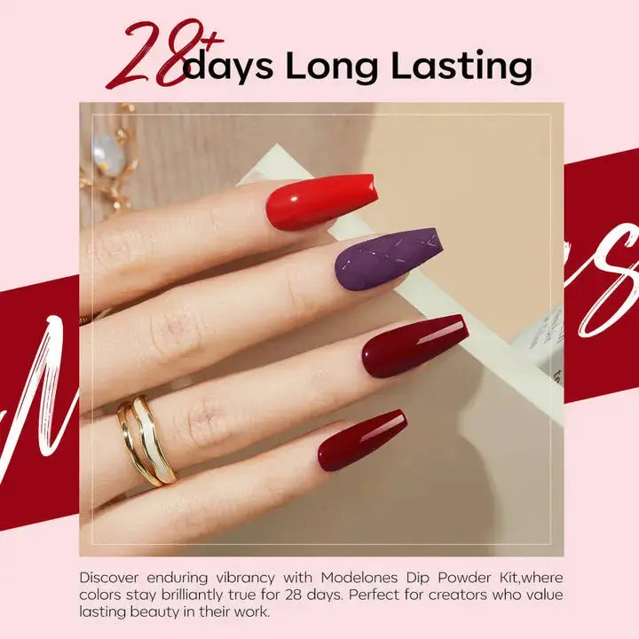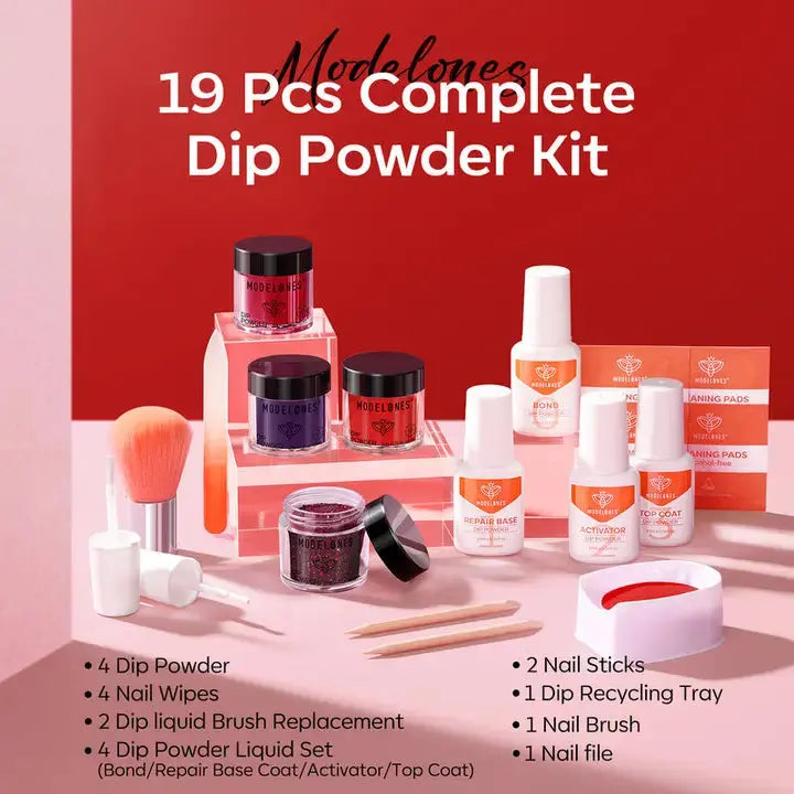 De Modelones All-In-One Dip Powder Kit Blood Plum is een complete 19-delige set waarmee je in no time prachtige, diepe en glanzende dip powder manicures creëert. De rijke Blood Plum tinten variëren van romig tot sprankelend glitter, zodat je elke look kunt maken van chic en klassiek tot bold en glam. Dankzij de makkelijke applicatie en snelle droogtijd is deze kit perfect voor zowel beginners als ervaren nagelliefhebbers.
