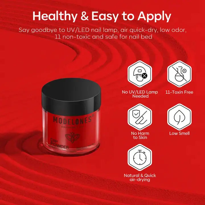 Dip Powder 10 gr: Polymethyl Methacrylate, Tocopherol, Keratin, Benzoyl Peroxide.