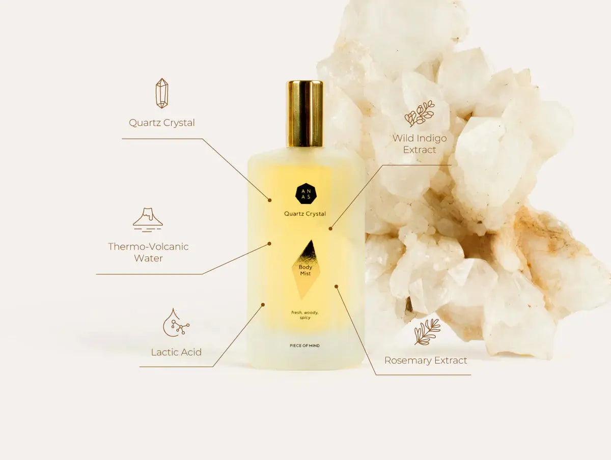 De Anas Quartz Crystal Body Mist is jouw verfrissende glow boost met een unieke crystal touch. Deze lichte mist is verrijkt met een echte Quartz Crystal en mineraalrijk Thermo Volcanisch water om je huid direct te hydrateren, te kalmeren en weer in balans te brengen.