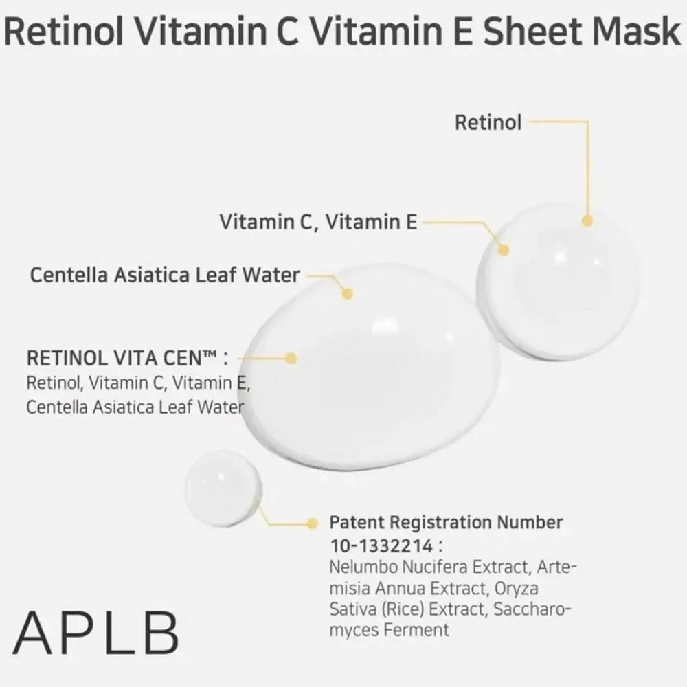 Het APLB Retinol Vitamin C Vitamin E Sheet Mask geeft je huid een boost. Dit verhelderende sheetmasker is doordrenkt met 10,5% Retinol Vita Cen™, een krachtige mix van retinol, vitamine C, vitamine E en Centella Asiatica Leaf Water. Samen helpen ze bij het kalmeren van de huid, verbeteren van de elasticiteit en zorgen ze voor een egale, frisse teint.