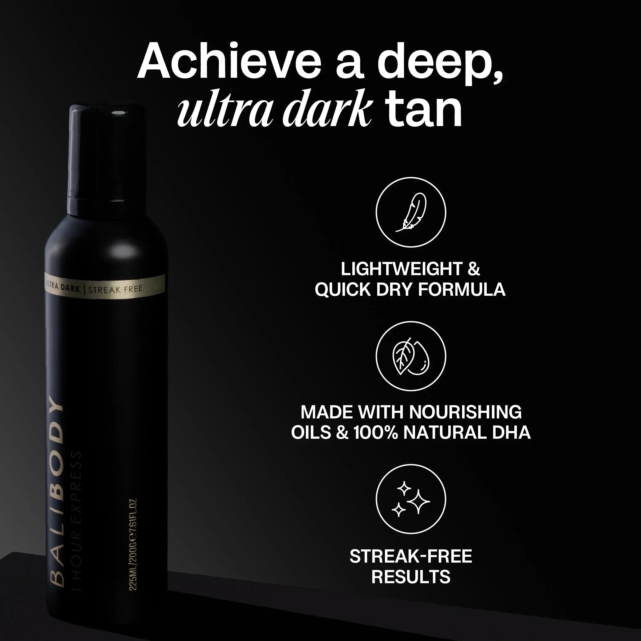 De Bali Body 1 Hour Express Tan Ultra Dark is een zelfbruiner waarvan het verbluffende resultaat van een glowy, gebruinde huid al na één uur zichtbaar is! Deze foam heeft een ultra lichtgewicht formule, waardoor je jouw fake tan snel, makkelijk en zonder strepen of vlekken aanbrengt.
