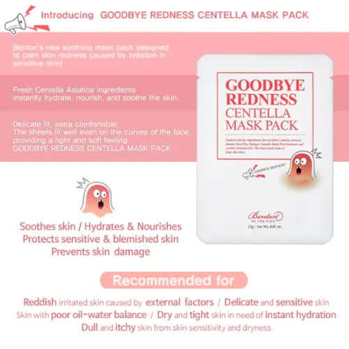 Zeg vaarwel tegen roodheid en verwelkom een gevoel van rust met het BENTON Goodbye Redness Centella Cica Mask Pack. Gun jezelf een spa-moment thuis en laat je huid genieten van de helende kracht van dit masker.
