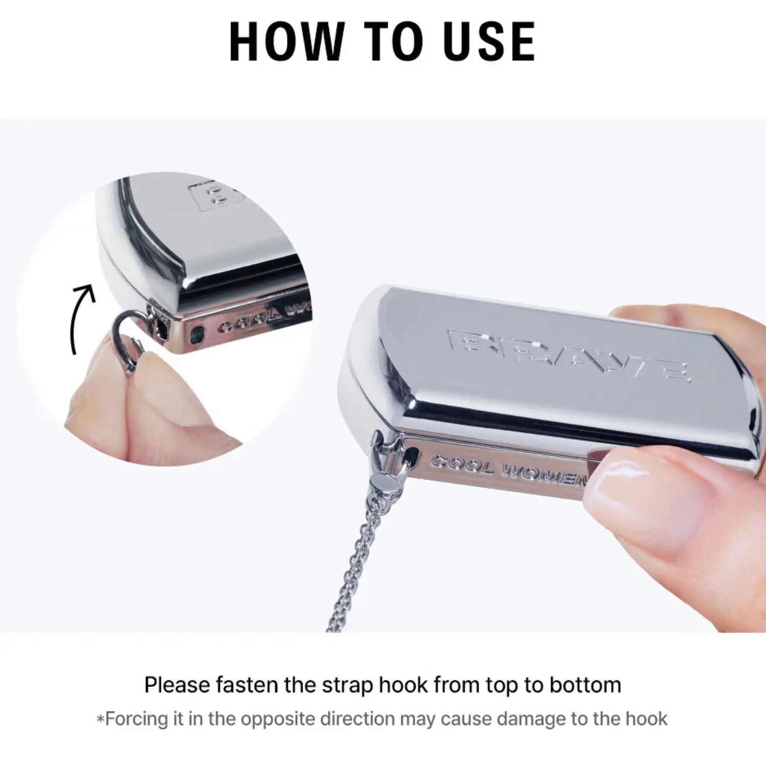 - Bevestig de strap aan de BRAYE Lipsleek Lip and Cheek door de haakjes in de juiste richting vast te maken.