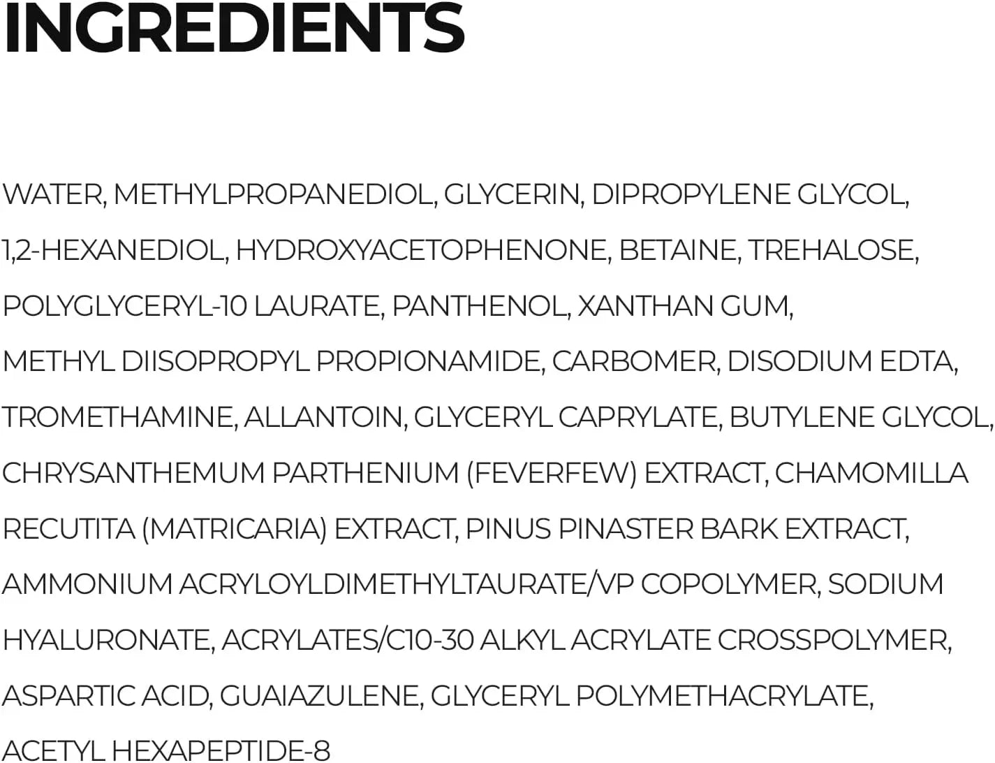 Water, Methylpropanediol, Glycerin, Dipropylene Glycol, Glacier Water, Chamomilla Recutita (Matricaria) Extract, Chrysanthemum Parthenium (Feverfew) Extract, Pinus Pinaster Bark Extract, Sodium Hyaluronate, Panthenol, Betaine, Trehalose, Polyglyceryl-10 Laurate, Xanthan Gum, Methyl Diisopropyl Propionamide, Carbomer, Disodium EDTA, Tromethamine, Allantoin, Butylene Glycol, Acrylates/C10-30 Alkyl Acrylate Crosspolymer, Ammonium Acryloyldimethyltaurate/VP Copolymer, Guaiazulene, Glyceryl Polymethacrylate, Acetyl Hexapeptide-8, Aspartic Acid, 1,2-Hexanediol, Hydroxyacetophenone
