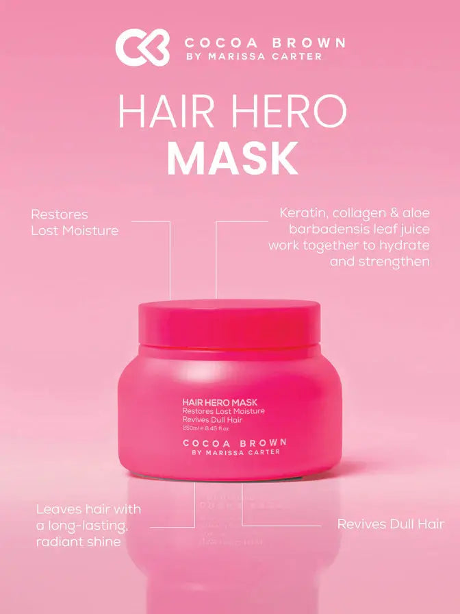 Het Cocoa Brown Hair Hero Hair Mask is jouw redder in nood voor gestrest, droog of beschadigd haar. Van stressed naar strengthened in één luxe treatment. Dit intens voedende haarmasker is verrijkt met Hydrolyzed Keratin, Hydrolyzed Collagen, Hyaluronic Acid en Aloe Barbadensis Leaf Juice om je lokken diep te hydrateren, versterken en een langdurige, stralende glans te geven. Perfect voor haar dat dof, breekbaar of uitgedroogd aanvoelt.