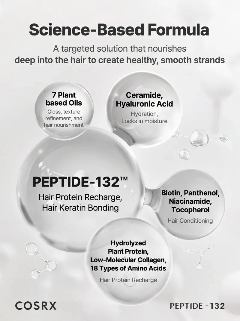 De COSRX Peptide-132 Bonding Treatment is jouw at-home oplossing voor salonwaardig haarherstel. Deze intensieve treatment is verrijkt met het gepatenteerde PEPTIDE-132™ complex dat beschadigde haarverbindingen herstelt en lokken omhult met voedende plantaardige oliën. Het resultaat? Zacht, glanzend en pluisvrij haar dat weer sterk en veerkrachtig aanvoelt, zonder gedoe.