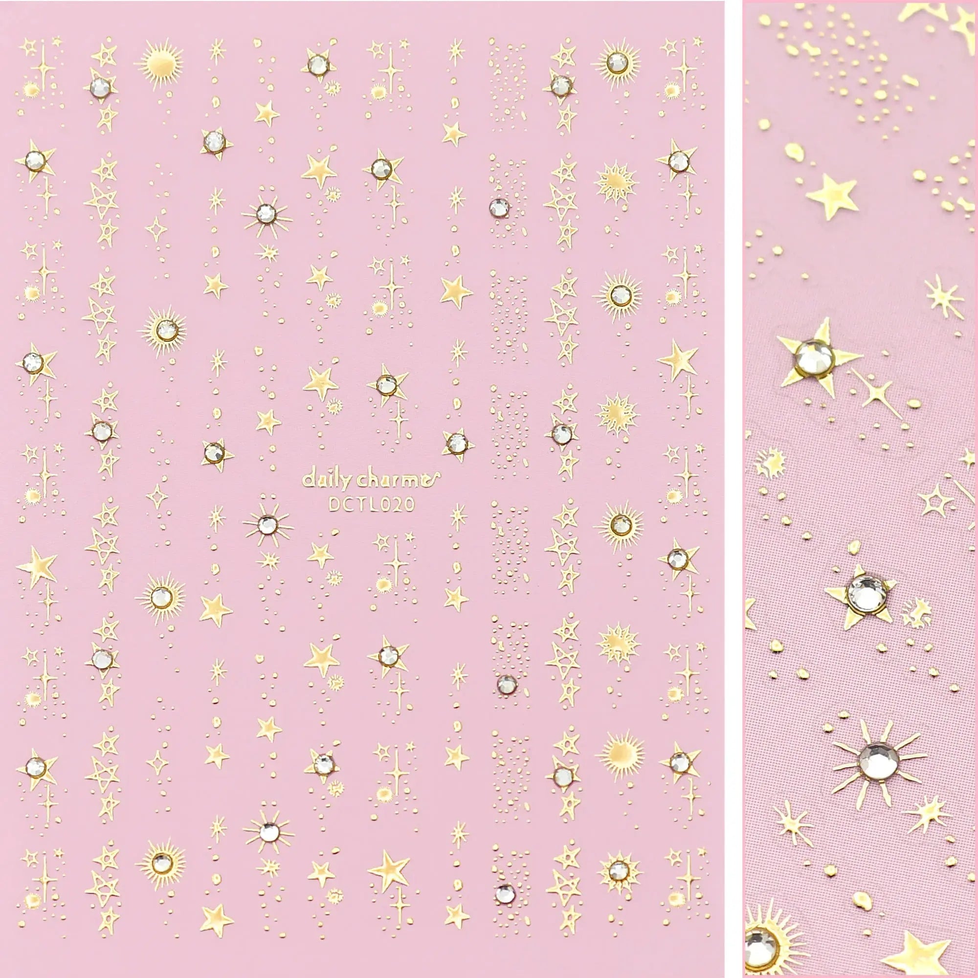 De stickers hebben een licht verhoogde textuur en zijn afgewerkt met glinsterende strass steentjes voor een 3D-effect. Dankzij het flexibele, zelfklevende materiaal pas je ze moeiteloos aan op natuurlijke of kunstnagels, zónder lijm of gel. Combineer ze met diepe tinten of zachte pastels voor een droommanicure die echt out of this world is.