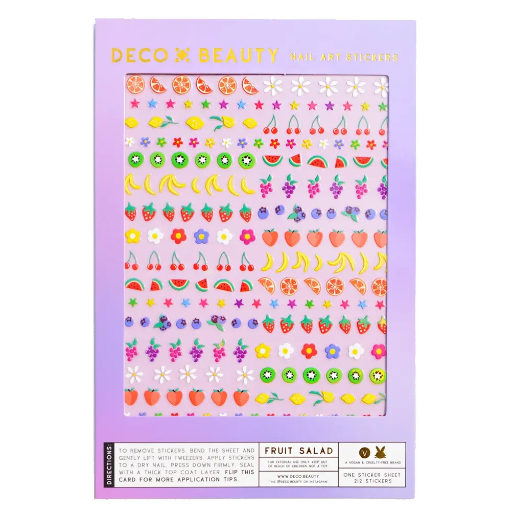 De Deco Beauty Nail Art Stickers Fruit Salad zijn een echte musthave voor iedere nail art lover. Deze tiny handgetekende fruit designs geven je manicure een frisse, speelse en zomerse vibe waar je meteen vrolijk van wordt.