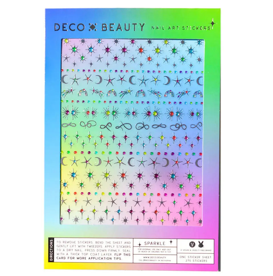 De Deco Beauty Nail Art Stickers Sparkle laten je nagels stralen als een heldere sterrenhemel. Met rainbow en zilveren designs geef je jouw manicure die populaire twinkling nail trend waar iedereen verliefd op is.
