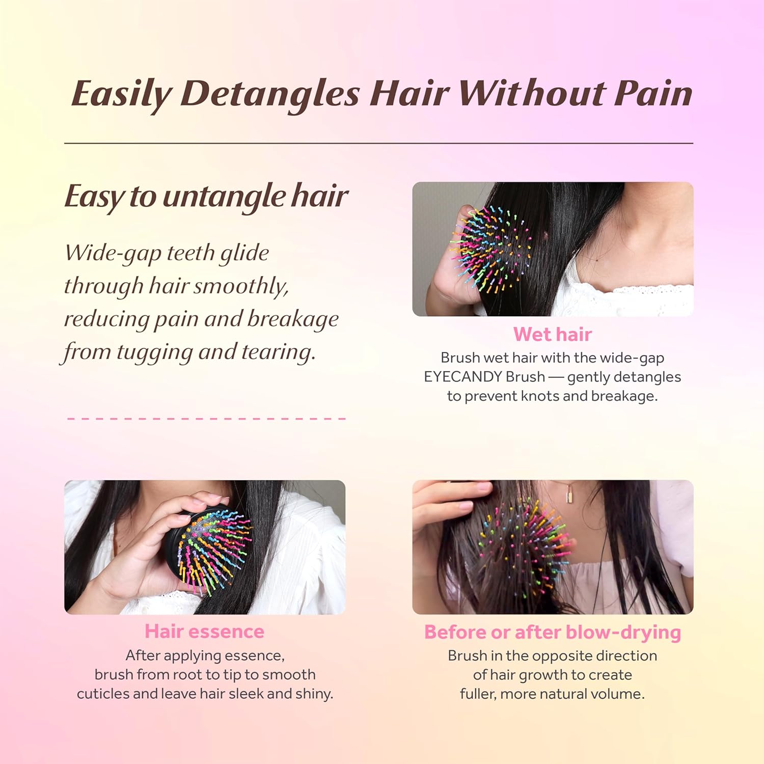 De Eyecandy Rainbow Volume S Brush Medium Melon Green is een must-have als je op zoek bent naar een borstel die zacht is voor je haar én je hoofdhuid. Dankzij het slimme ontwerp met speciaal gevormde S-vormige tanden wordt je haar moeiteloos en pijnloos ontward. De bredere afstand tussen de haartjes maakt het borstelen comfortabeler en voorkomt dat haren afbreken of uitgetrokken worden.