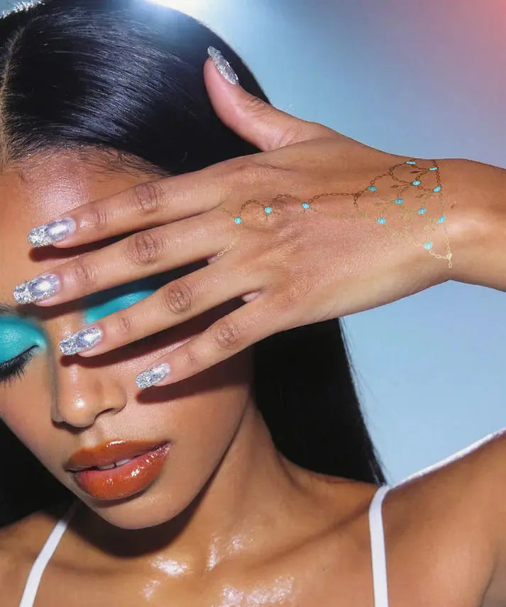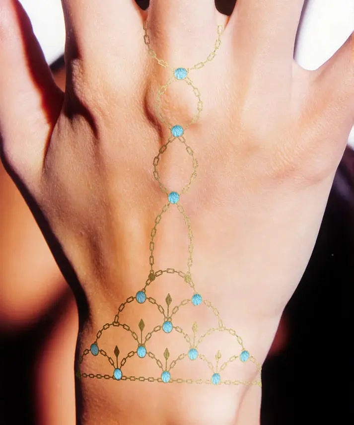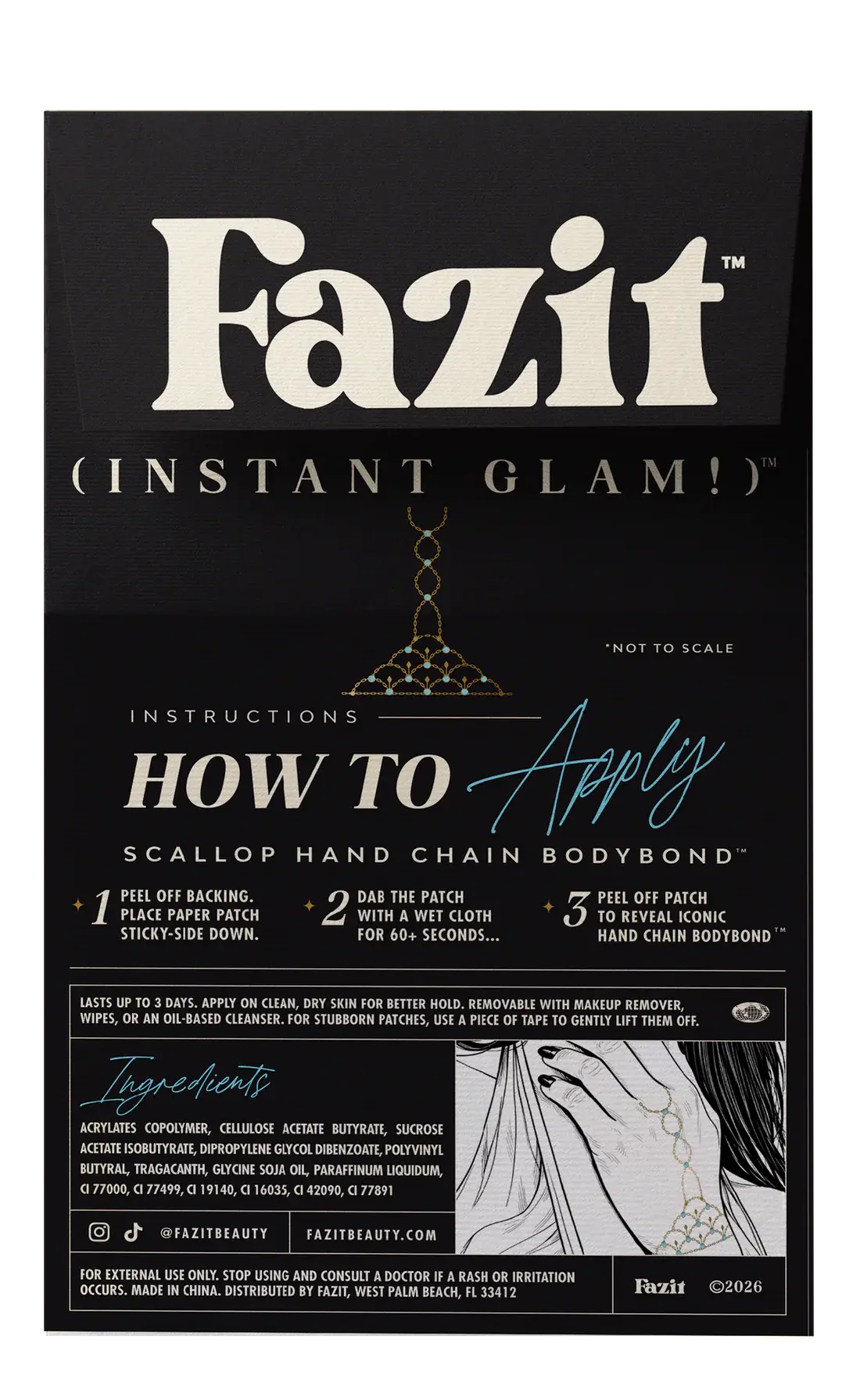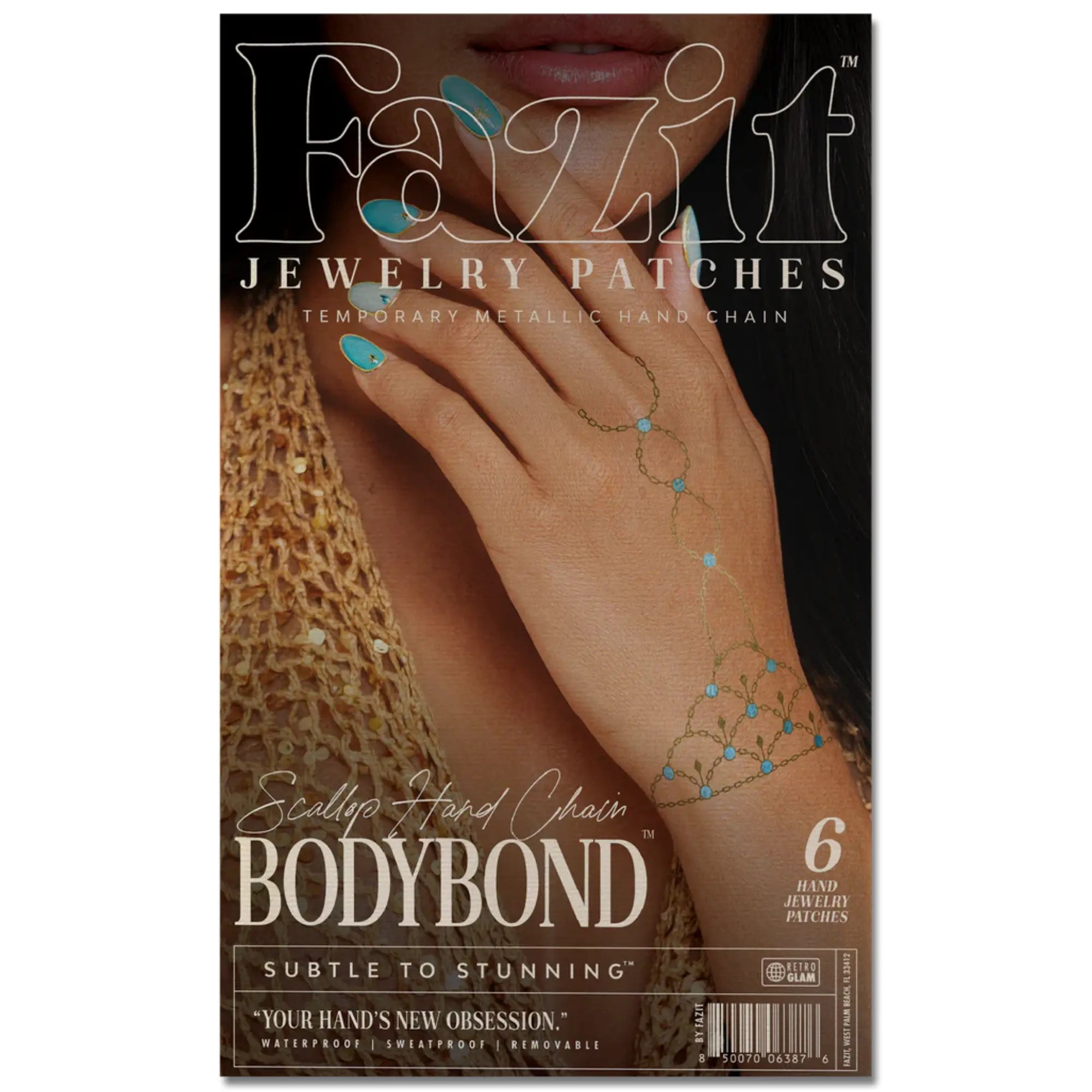 De Fazit Scallop Hand Chain BodyBond geeft jouw look direct een unieke, elegante touch! Deze innovatieve jewelry patch brengt een delicate hand chain met goud en turquoise tinten rechtstreeks op je huid aan. Het design loopt sierlijk van je pols naar je vinger en creëert een verfijnd detail dat elke beweging laat opvallen.