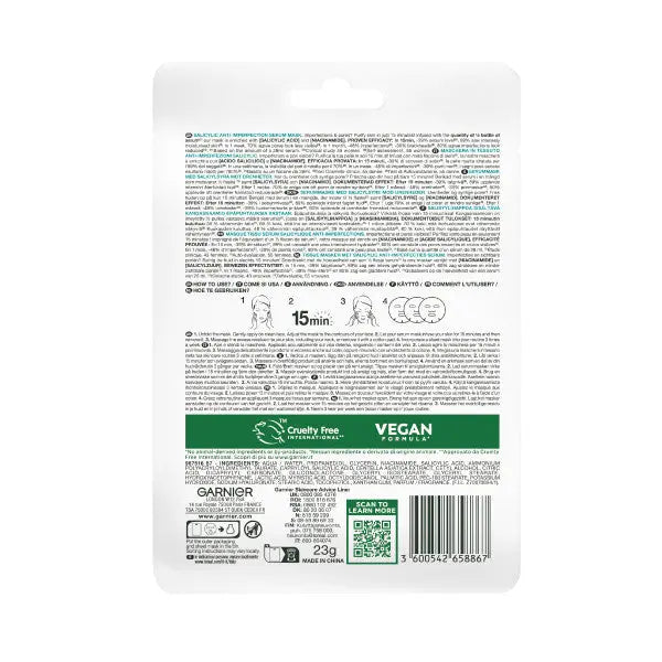 De Garnier PureActive Salicylic Anti-Imperfection Serum Mask is jouw snelle skin reset bij onzuiverheden en zichtbare poriën. Dit innovatieve tissue masker zit boordevol serum, vergelijkbaar met een halve fles, en geeft je huid in slechts 15 minuten een intensieve verzorgingsboost.