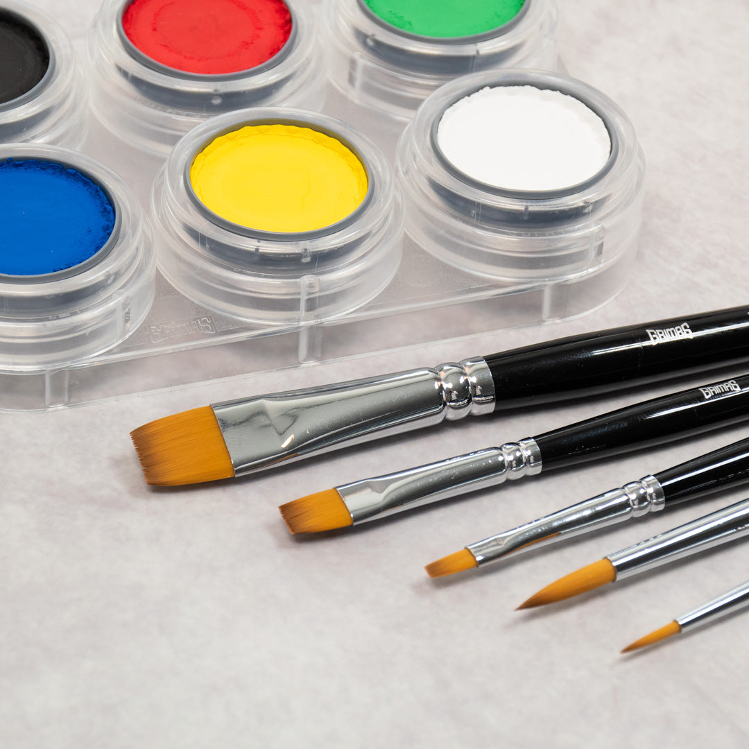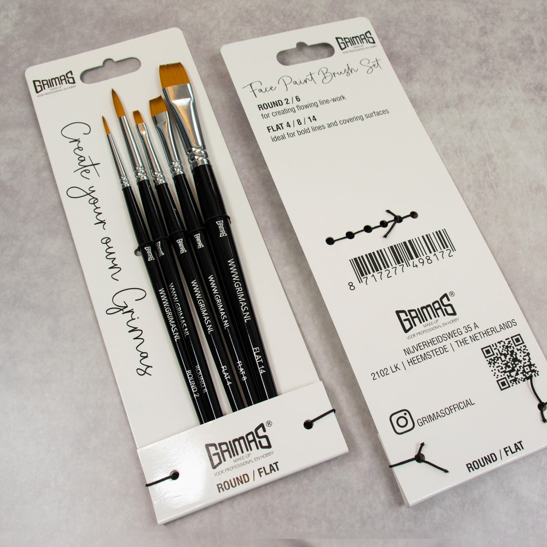 De set bevat 5 synthetische penselen: 2 ronde (maat 2 & 6) voor detail en lijnen, en 3 platte (maat 4, 8 & 14) voor het strak aanbrengen van kleur en het inkleuren van grotere oppervlakken. Ze nemen schmink goed op, liggen comfortabel in de hand en behouden hun vorm: ook na veel gebruik. Combineer deze set met andere Grimas brush sets voor nóg meer creatieve mogelijkheden.