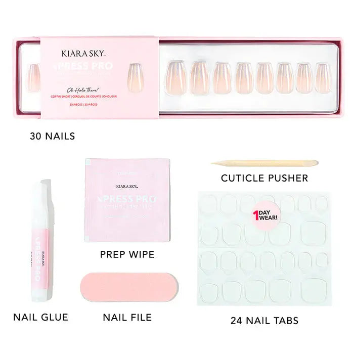 De Kiara Sky xPress Pro Press-on Nails Oh Holo There zijn dé holografische ombre nails waar je meteen verliefd op wordt. Deze short coffin set combineert een zachte nude basis met een multi-dimensionale holo glow die schittert bij elk licht. Het resultaat? Een natuurlijke look met een glamorous twist.