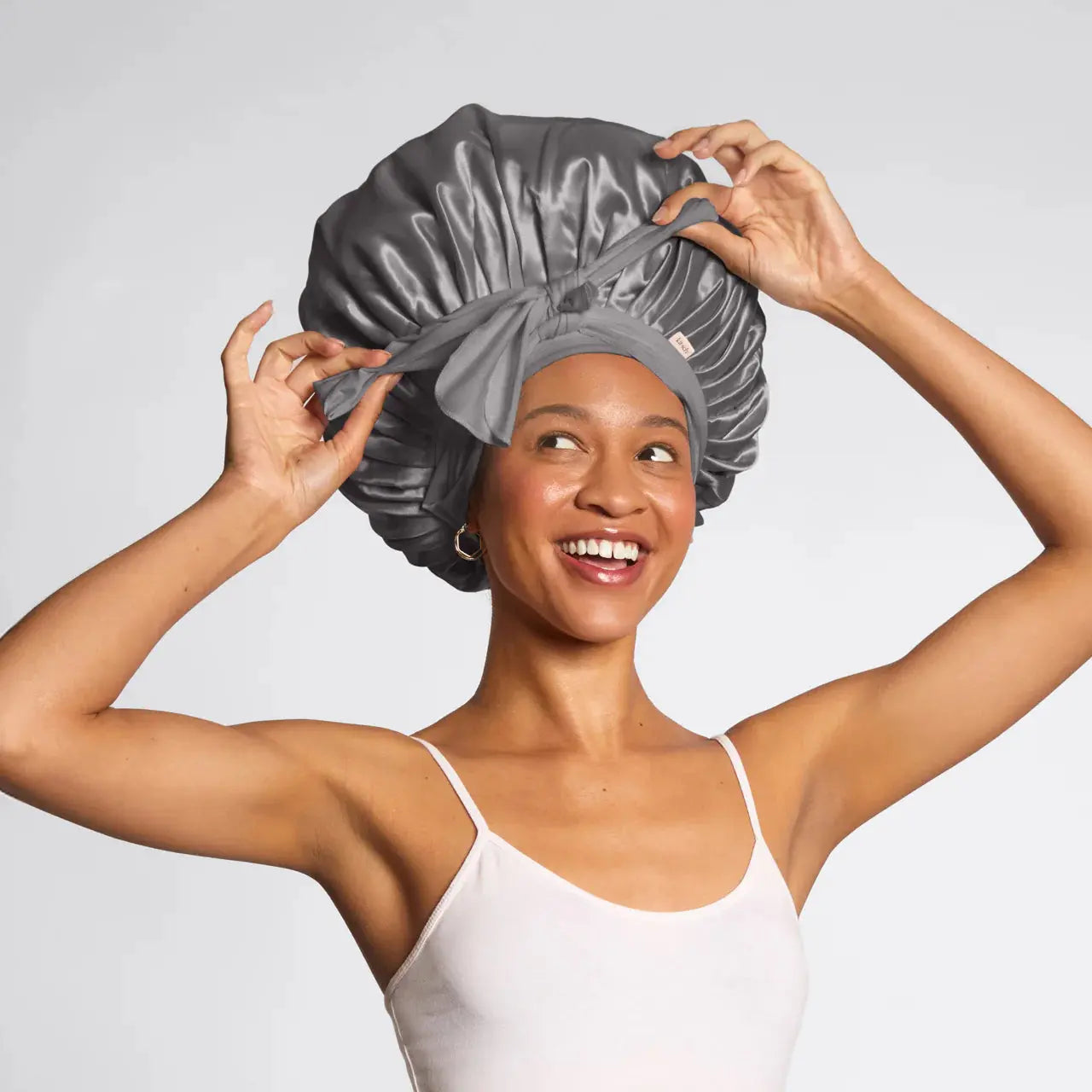 - Plaats de bonnet over je haar en trek de linten aan voor een stevige, comfortabele pasvorm.