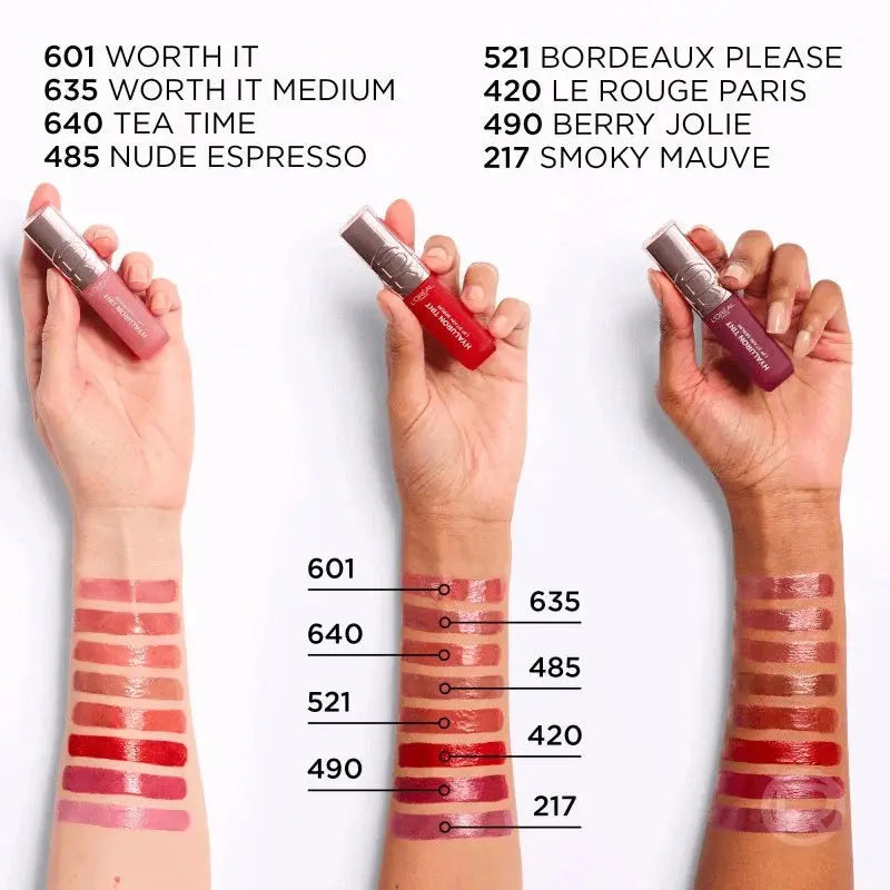 De L'Oréal Paris Hyaluron Tint Lipstain 640 Tea Time is jouw nieuwe must-have als je houdt van verzorgde lippen met een langdurige, frisse kleur. Deze vloeibare lipstain combineert het comfort van een serum met de houdbaarheid van een stain: licht, hydraterend en super draagbaar.