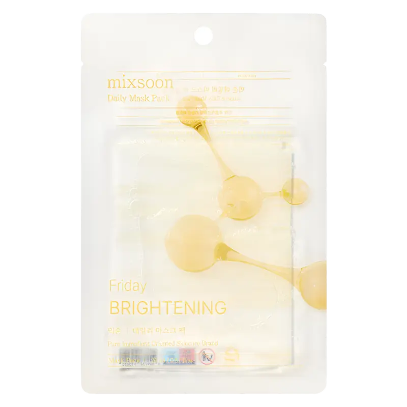 De Mixsoon Daily Mask Pack Friday Brightening is hét sheetmasker voor een stralende start van je weekend! Dit ultradunne masker is gemaakt van 0.2 mm plantaardige cellulose en sluit perfect aan op je huid, zodat de essence met Niacinamide en Alpha-Arbutin diep kan doordringen en jouw teint zichtbaar oplicht. De ideale treat voor doffe, vermoeide huid die wel wat glow kan gebruiken!