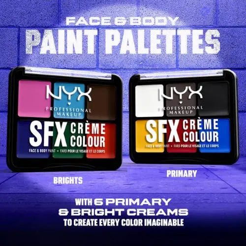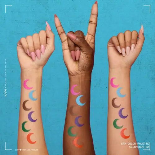 - Breng de gewenste kleur uit de NYX Cosmetics Halloween 24 SFX Face & Body Paint Palette aan op een schone, droge huid.
