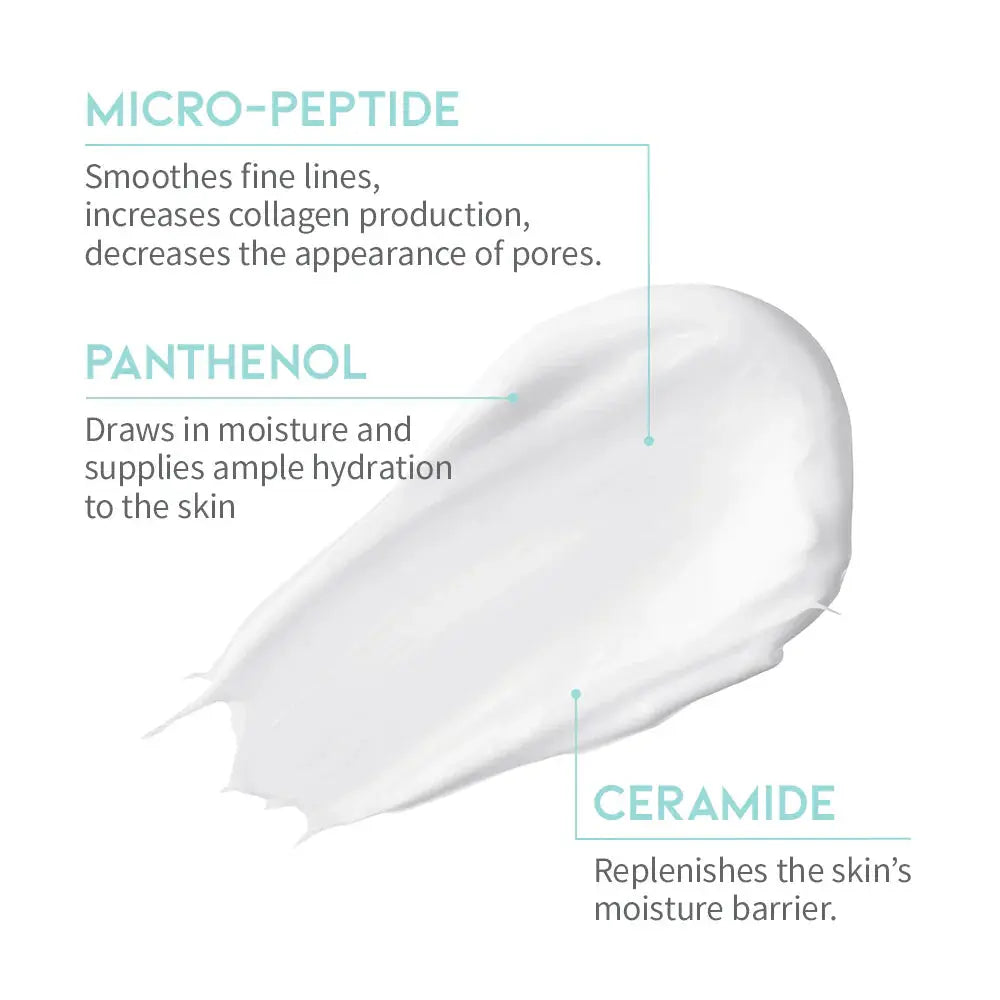 De crème hydrateert intens, voorkomt vochtverlies en geeft je huid tegelijkertijd een anti-aging boost dankzij de toegevoegde peptides. Ceramiden helpen je huidbarrière gezond te houden, terwijl panthenol (vitamine B5) zorgt voor een kalmerende, herstellende werking. Perfect voor de gevoelige, droge of gestreste huid die snakt naar comfort en stevigheid. Hello plump & protected skin!