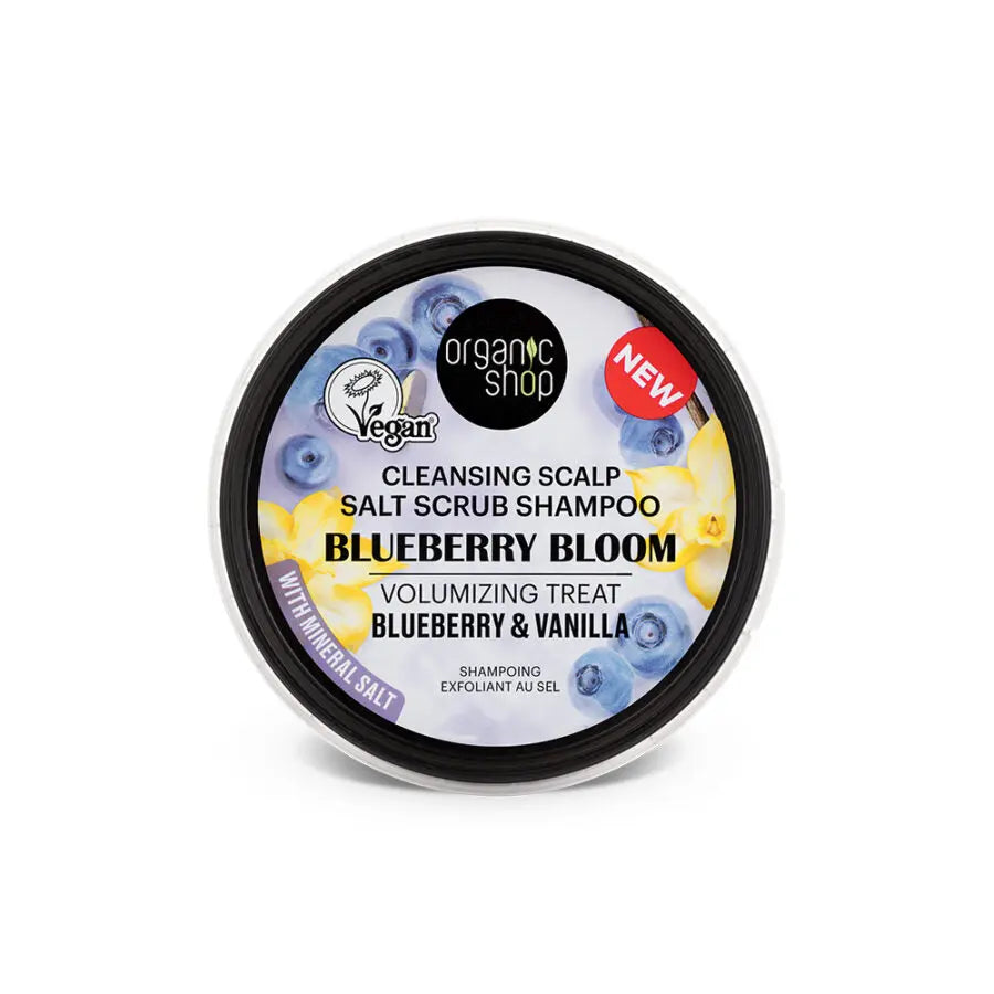 De Organic Shop Salt Scrub Shampoo Blueberry Bloom is jouw nieuwe geheime wapen tegen pluis en knopen! Deze heerlijke scrub-shampoo combineert natuurlijke zeezout met organic blueberry en organic vanilla om je hoofdhuid intens te reinigen én je haar weer tot leven te wekken. Denk: volume, glans en bounce: allemaal in één vrolijke pot!