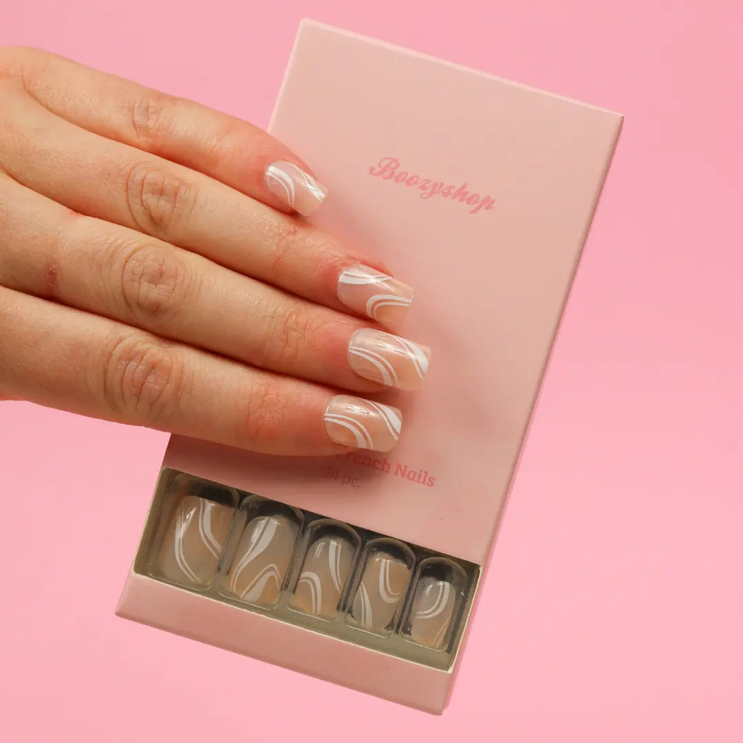 De Boozyshop Press On French Nails Waves zijn de perfecte oplossing voor prachtige nagels in een handomdraai. Deze kunstnagels zijn niet alleen stijlvol, maar ook nog eens voorzien van een subtiel wave design dat je nagels een elegante en verzorgde look geeft. Trakteer jezelf op een snelle manicure met deze set press on nails, bestaande uit 24 stuks in 12 verschillende maten. Elke nagel is genummerd van 0 tot 11, wat het makkelijker maakt de meest geschikte maat te kiezen. Daarnaast bevat deze set ook nagellijm en een prep pad om je nagels optimaal voor te bereiden op een langdurige hechting.
