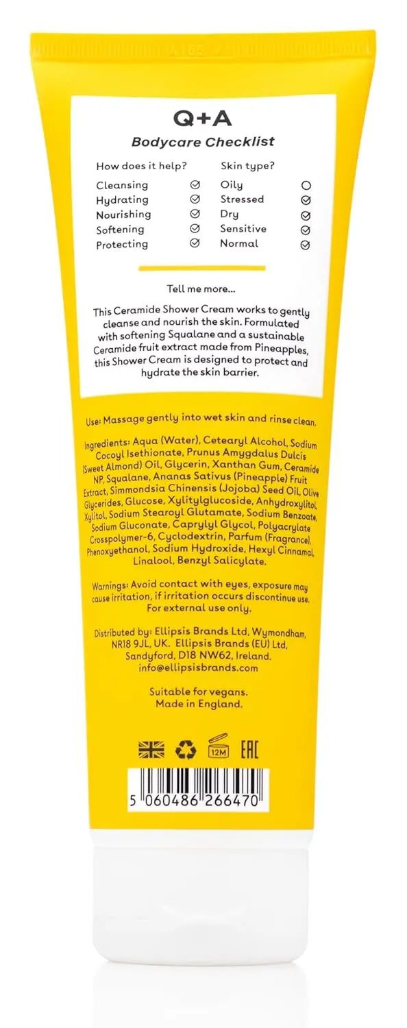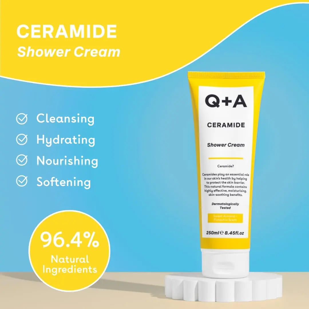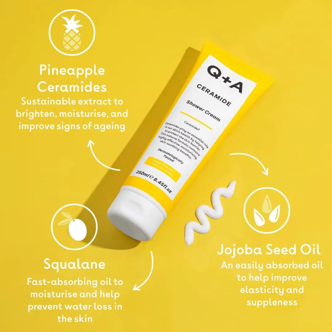 De Q+A Ceramide Shower Cream is jouw nieuwe favoriet voor een voedende en luxueuze douchebeleving. Deze zachte, romige douchecrème reinigt de huid op milde wijze met een lichte schuimtextuur, terwijl krachtige ingrediënten als squalaan, jojoba-olie en ananasceramiden de huid intens verzorgen.