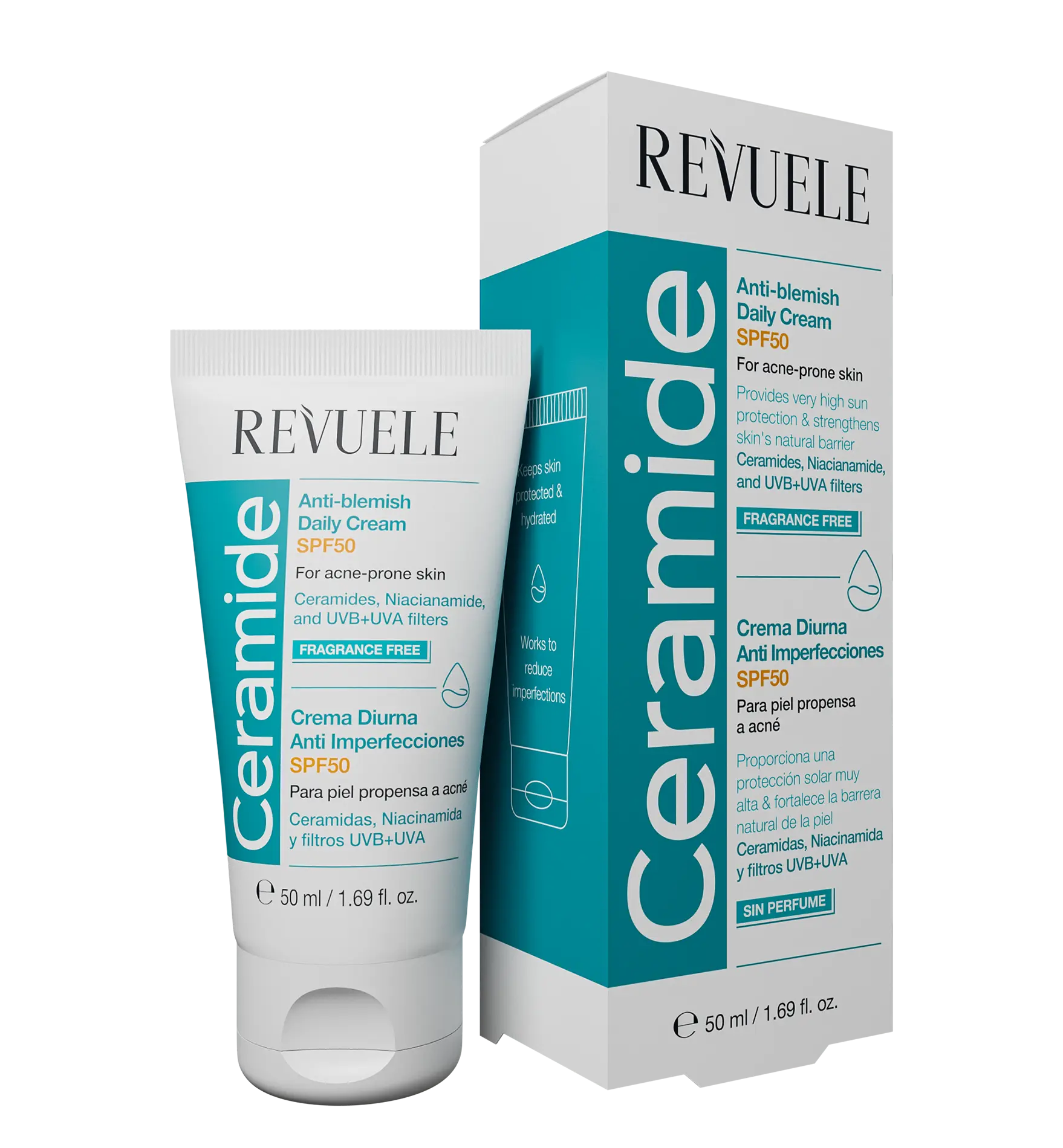 De Revuele Ceramide Anti Blemish Daily Cream SPF50 is een lichte, hydraterende crème. De crème bevat Niacinamide om onzuiverheden tegen te gaan, SPF om je huid te beschermen tegen de zon en ceramide om de huid te hydrateren. Een perfecte toevoeging aan je skincare routine dus!