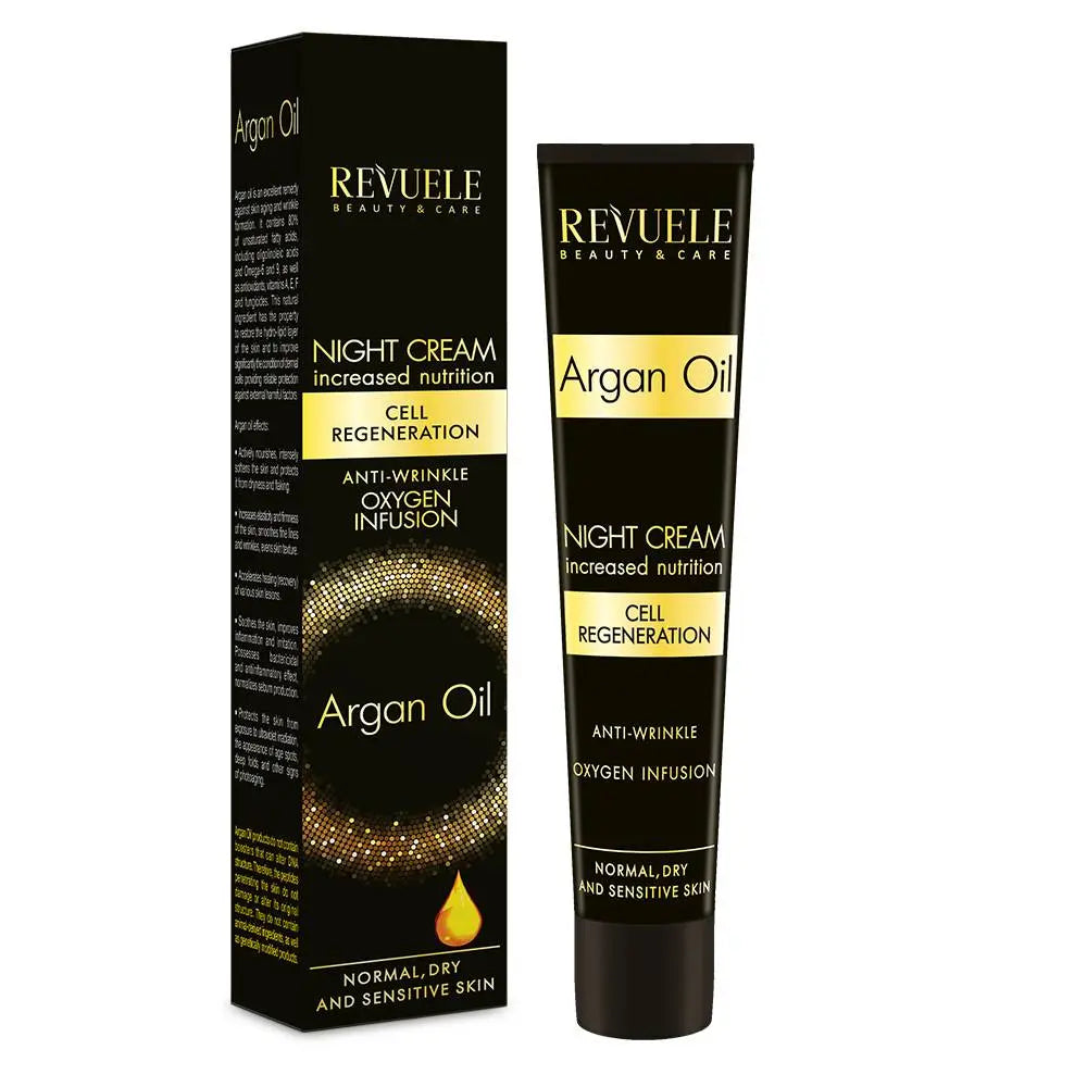 Revuele Face Night Cream Argan Oil is een rijke nacht creme voor droge, vermoeide huid met roodheid. Deze zachte creme vermindert gezichtsrimpels en helpt tegen tekenen van voortijdige veroudering. De formule geeft een intense hydratatie aan je huid en verbeterd de huid elasticiteit.
