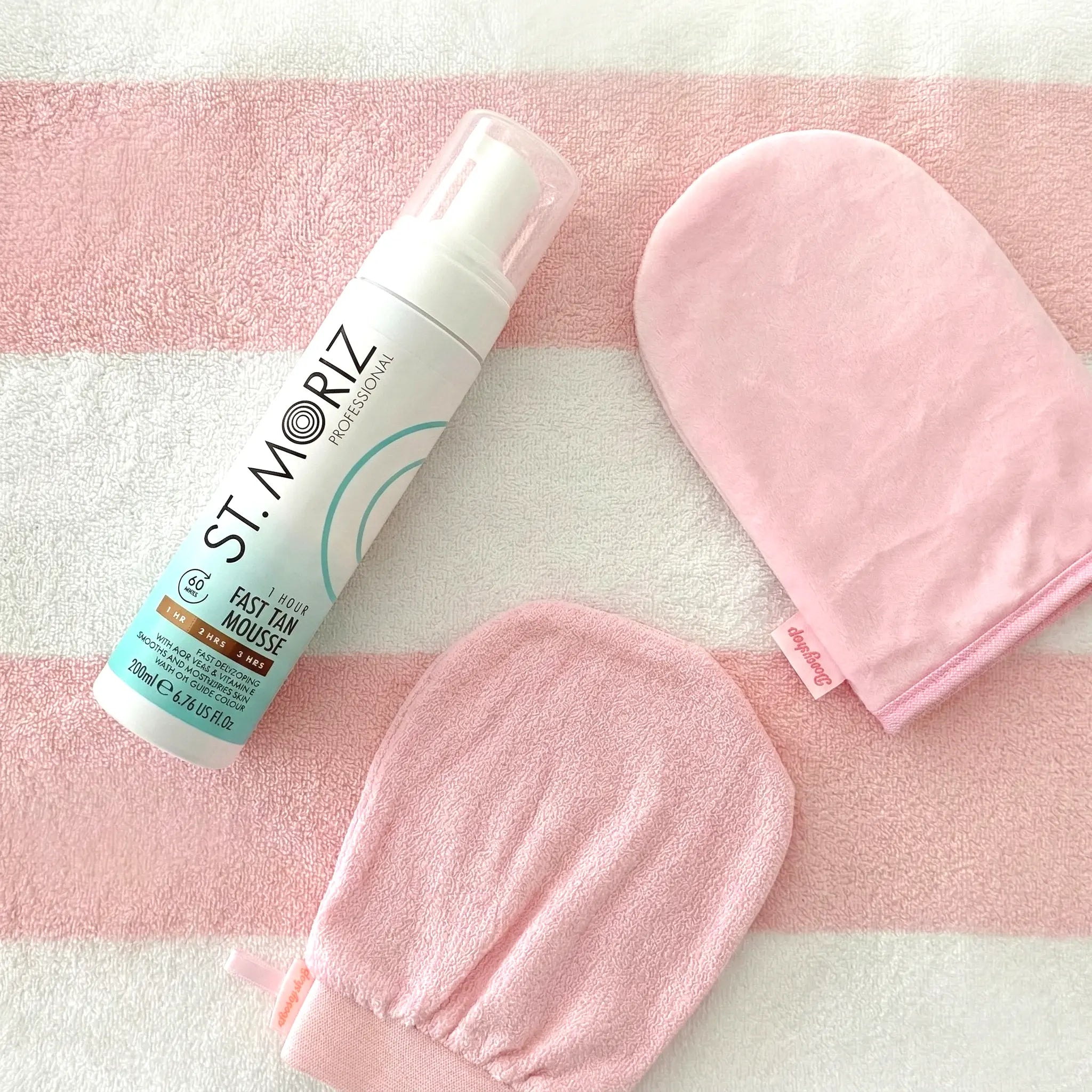 - Neem een kleine hoeveelheid van de St. Moriz Fast Tanning Mousse op de Boozyshop Tanning Mitt.