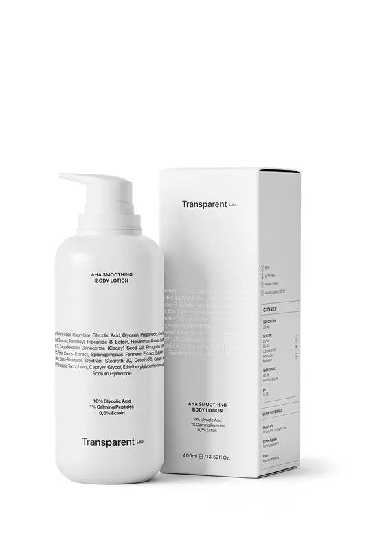 Deze Transparent Lab AHA Smoothing Body Lotion is een lotion met een krachtige formule die de huidtextuur verbetert en zorgt voor een zijdezachte afwerking. Deze body lotion is verrijkt met Alpha Hydroxy Acids (AHA's), die dode huidcellen verwijderen en de celvernieuwing stimuleren, waardoor je huid gladder en stralender wordt.