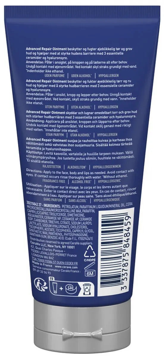 The CeraVe Advanced Repair Ointment is your ultimate saviour for dry, chapped or cracked skin. This nourishing balm, based on petrolatum, creates a protective layer on the skin to prevent moisture loss and keep skin intensely hydrated. Enriched with hyaluronic acid and a tri-blend of ceramides, the formula not only helps to repair but also plumps, smooths and visibly softens the skin.