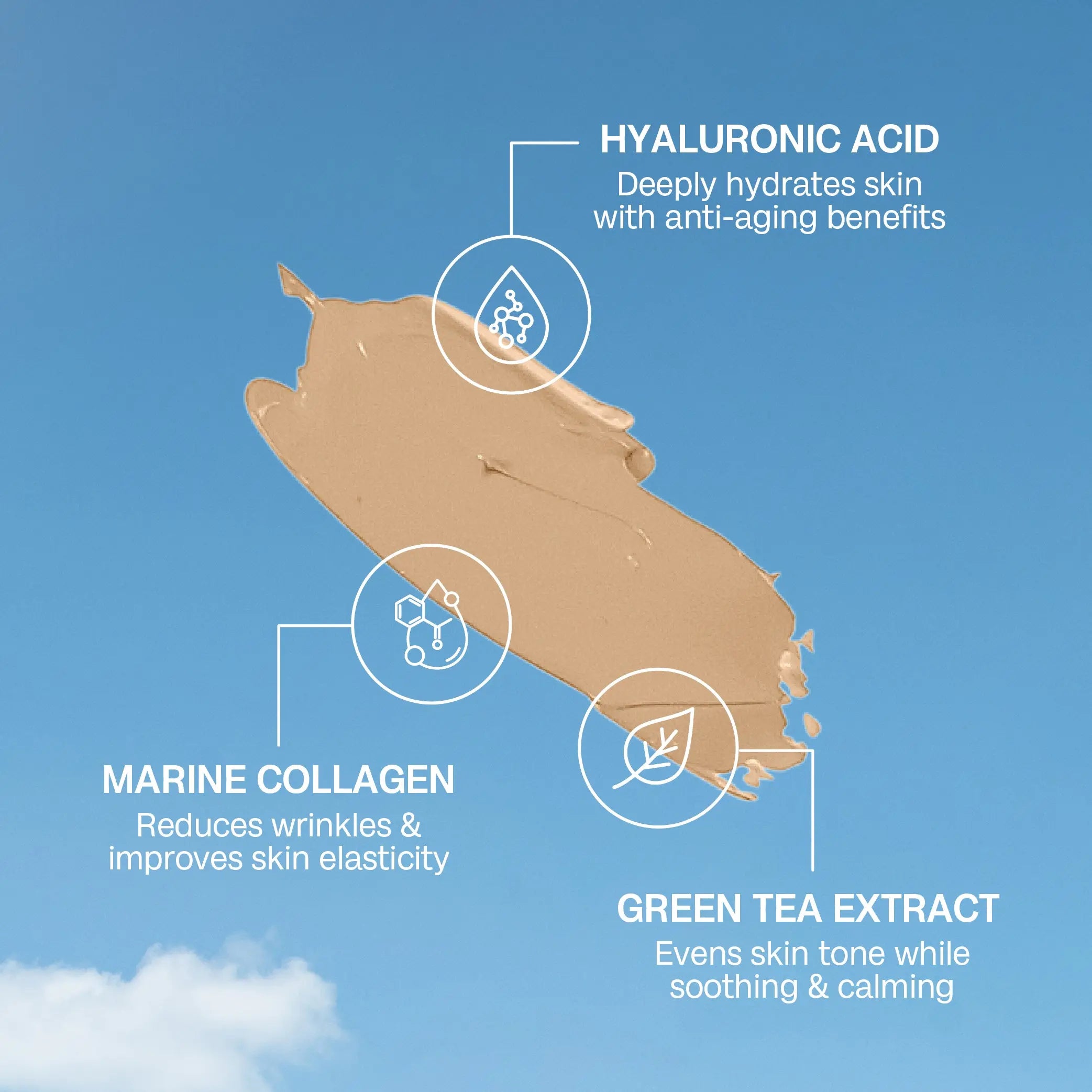 Water (Aqua), Propylene Glycol, Cyclopentasiloxane, Ethylhexyl Stearate, Glyceryl Stearate, Cyclohexasiloxane, Tapioca Starch, Cetearyl Alcohol, Vitis Vinifera (Grape) Seed Oil, Potassium Cetyl Phosphate, Cetearyl Olivate, Glycerin, Extractorbitan Gelliinseng, Root, Panorbitan Olivate Sinensis Leaf Extract, Sodium Hyaluronate, Butylene Glycol, Marine Collagen, Polysorbate 20, Fragrance (Perfume), Potassium Sorbate, Phenoxyethanol, Ethylhexylglycerin, Benzyl Alcohol, Mica, Titanium Dioxide, Iron Oxides. Actives: Butyl Methoxydibenzoylmethane, Ethylhexyl Methoxycinnamate, Benzophenone-3, Octocrylene.
