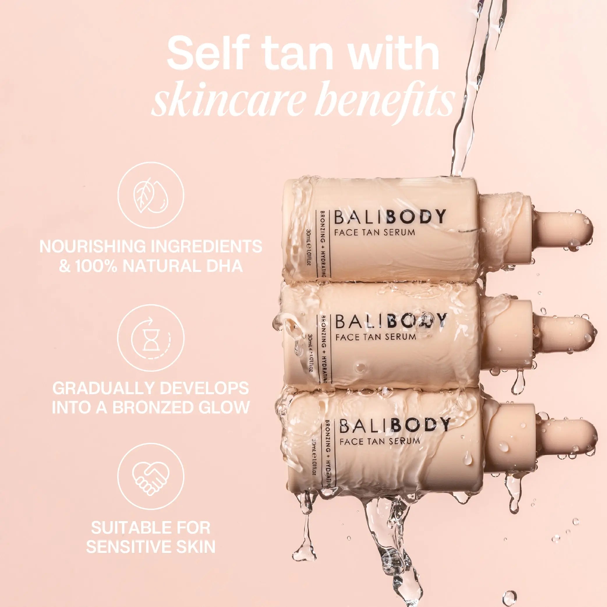 The Bali Body Face Tan Serum is a serum with self-tanner for your face, which is suitable for all skin types. This lightweight serum won't irritate your skin or clog your pores!