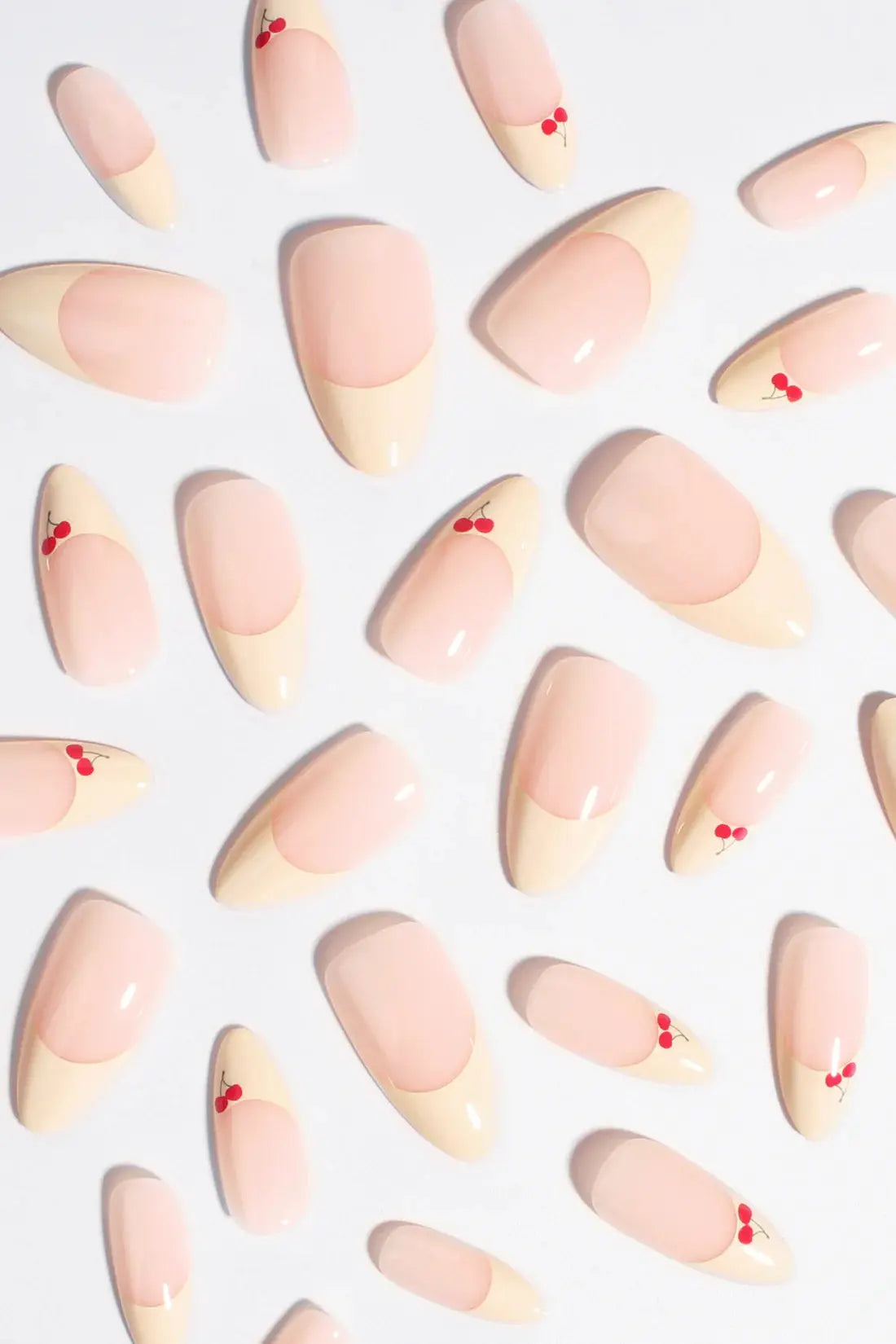 The Bonmuz Press-On Nails Cherry Charm give a playful twist to the classic French tip. Featuring a subtle cherry accent, these press-on nails add just the right amount of personality to a timeless and elegant look.
