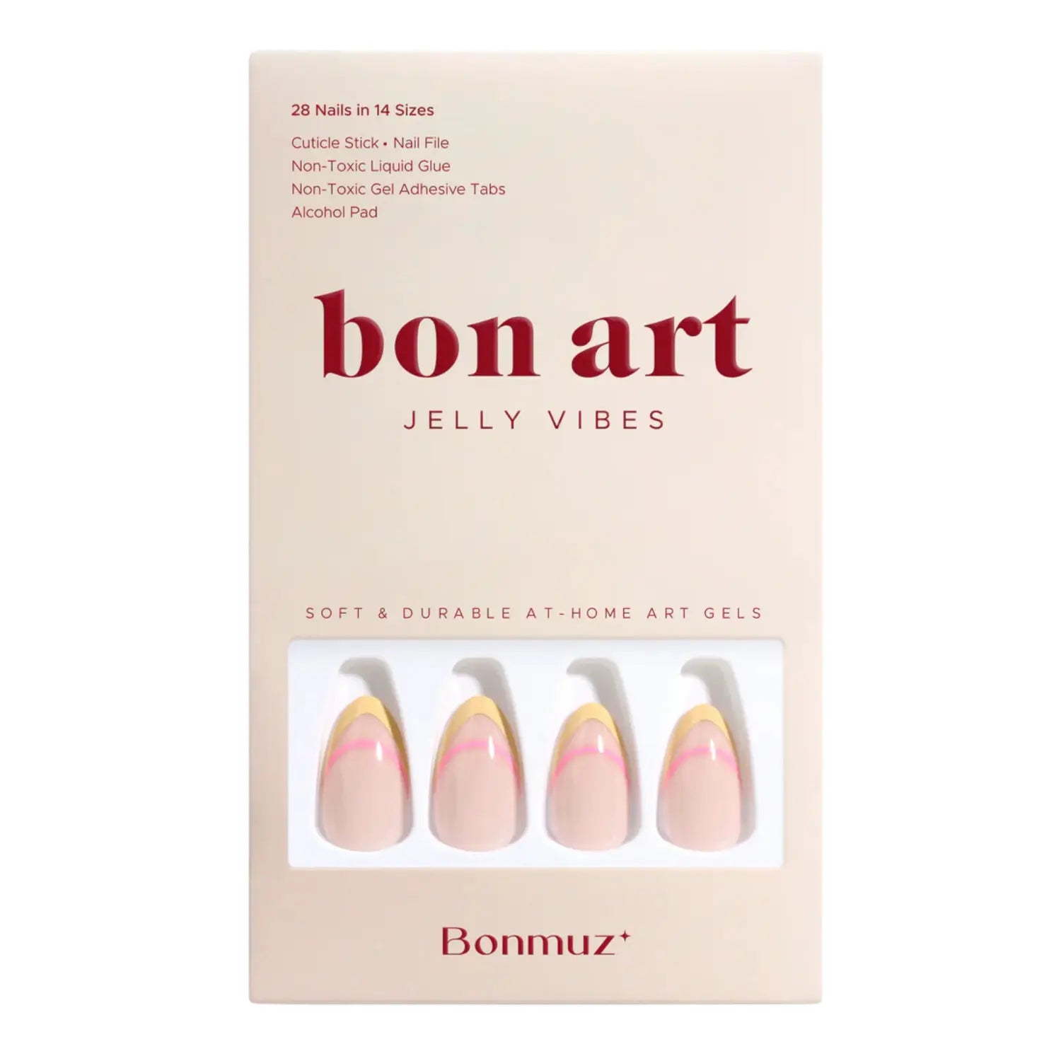 Content: 28 nails in 14 sizes, nail glue, sticky tabs, a file, a cuticle pusher, an alcohol pad.