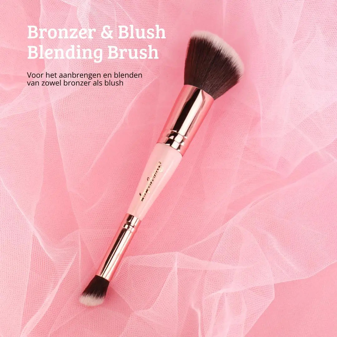 The Boozyshop Soft Pink & Gold Bronzer & Blush Blending Brush is the ultimate makeup brush for evenly applying and blending your bronzer and blush. Powder products apply effortlessly with this brush.