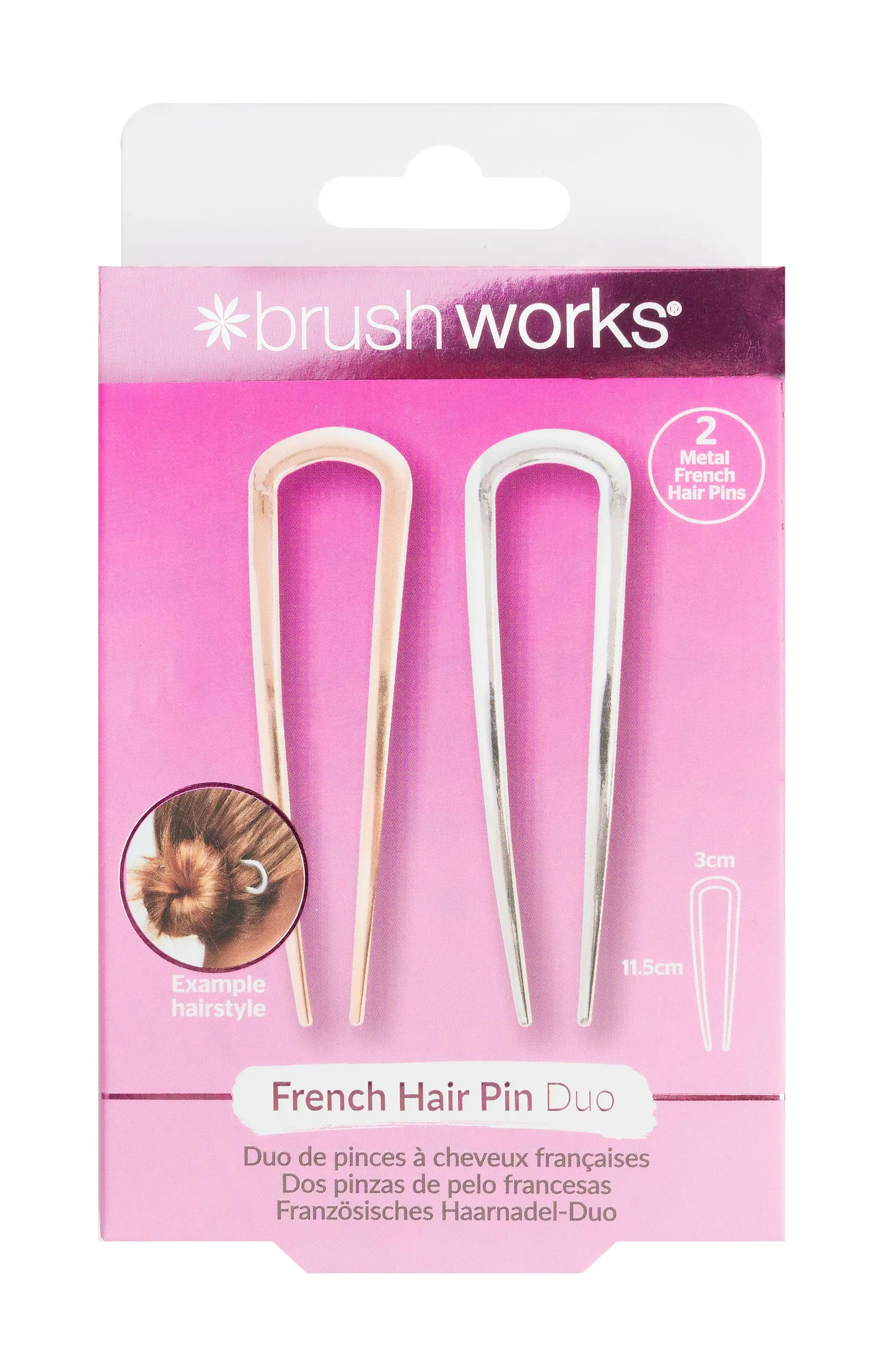 The Brushworks French Hair Pin Duo Gold & Silver is the perfect finishing touch for your effortless updo. These stylish hair pins in gold and silver instantly add an elegant vibe to your hairstyle while keeping your hair securely in place. Perfect for a relaxed messy bun or a classy updo.
