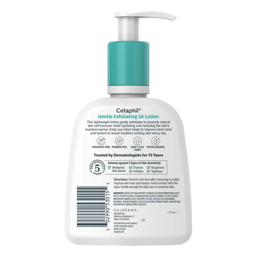 The Cetaphil Gentle Exfoliating SA Lotion is the go-to choice for anyone looking for a gentle yet effective daily exfoliator. This lightweight lotion combines three acids – salicylic acid (BHA), mandelic acid (AHA), and gluconolactone (PHA) to remove dead skin cells and visibly improve skin texture without disrupting the skin barrier. Perfect for sensitive skin!