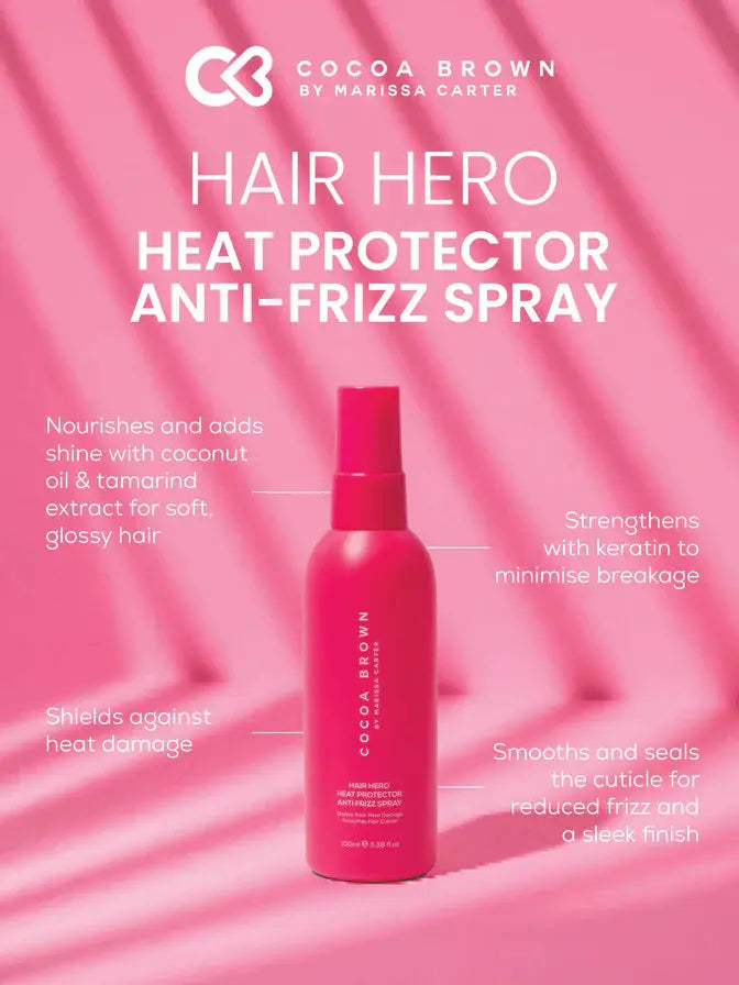 The Cocoa Brown Hair Hero Heat Protection Anti Frizz Spray is your ultimate styling sidekick for smooth, shiny, frizz-free hair. This lightweight leave-in spray protects your locks from heat while taming fly-aways for a salon-worthy finish: every single time.
