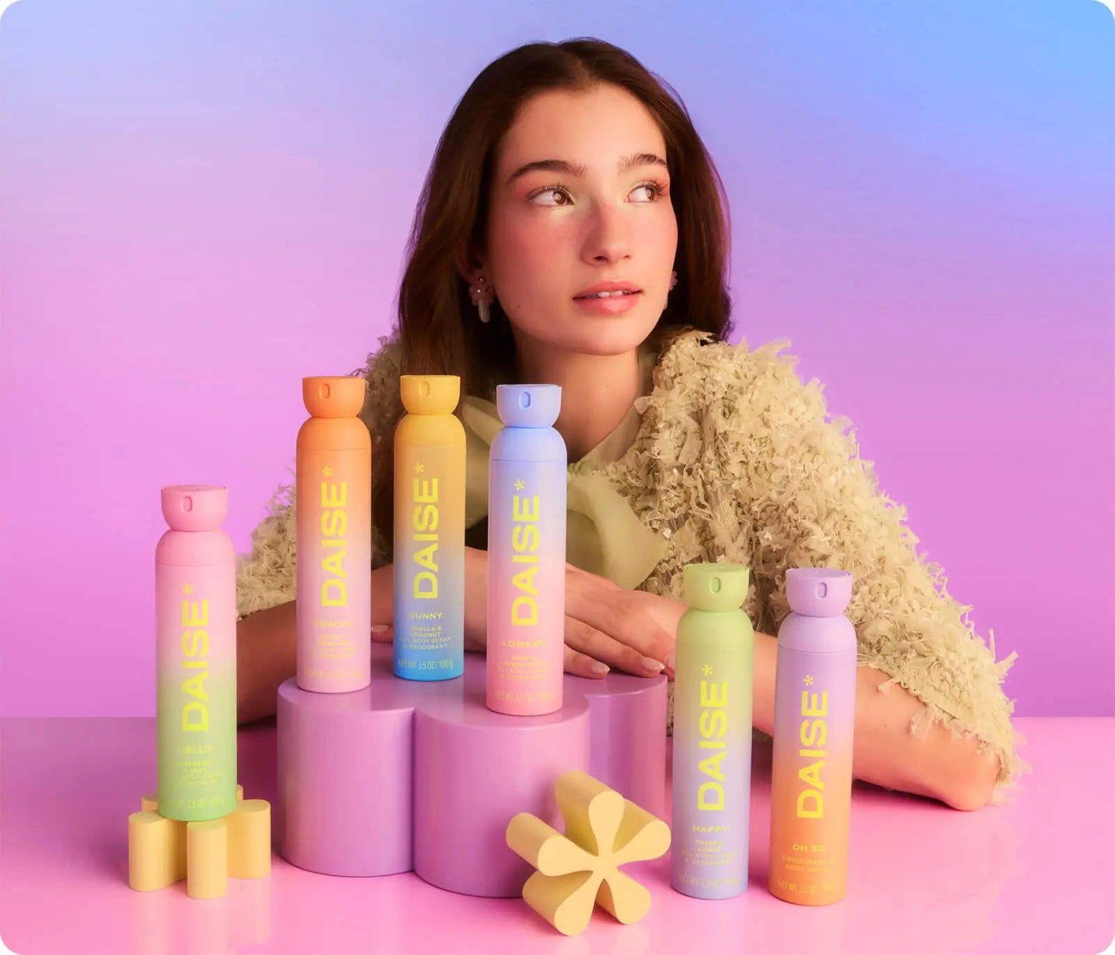 The Daise All Body Spray & Deodorant Hello is your new all-in-one body spray that combines freshness and care in one convenient mist. With a fruity scent of raspberry, blackcurrant, mint, creamy coconut and vanilla, you'll smell fresh and confident all day long.