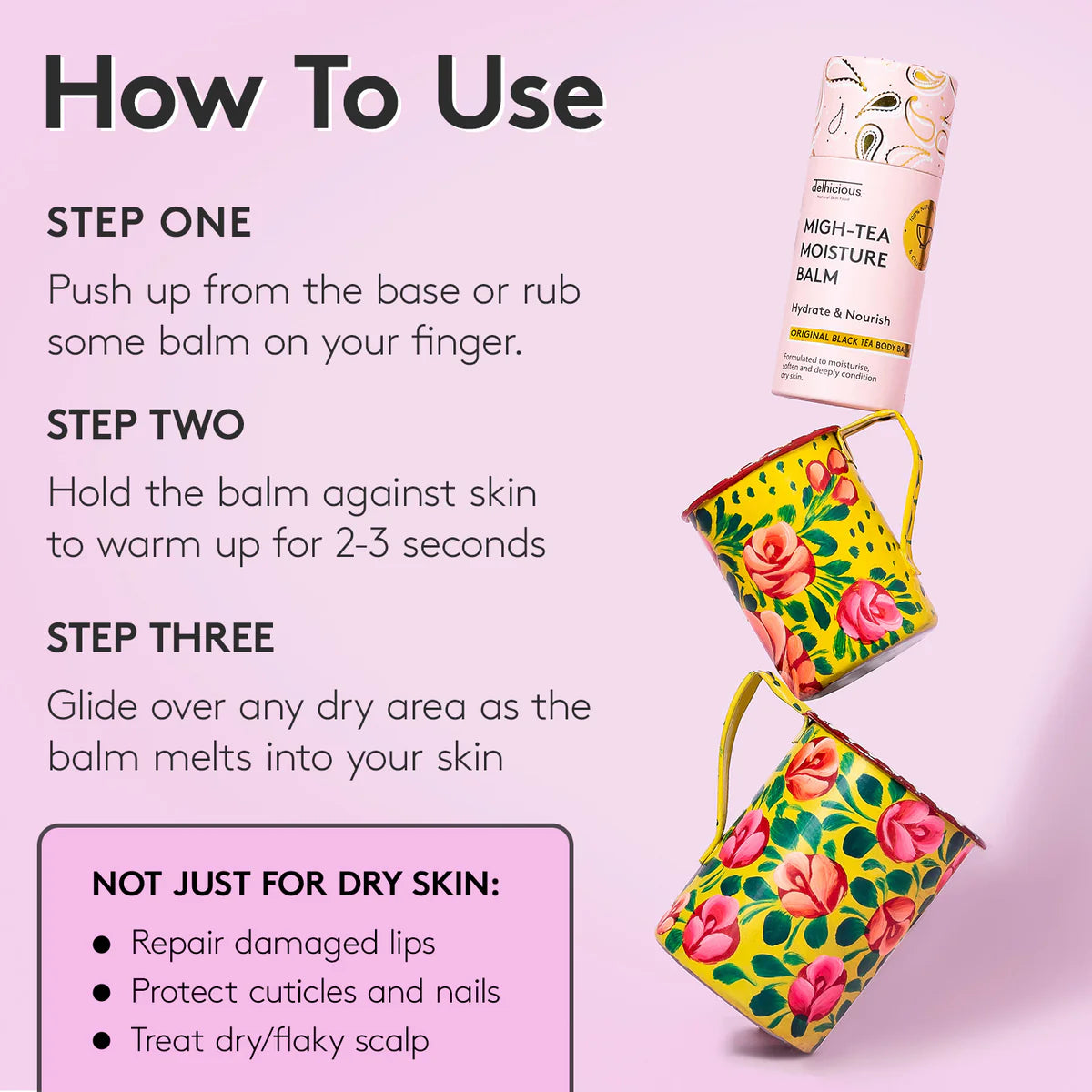 The balm comes in an eco-friendly push-up tube, making it easy and hygienic to apply. Perfect for dry areas like elbows, knees or shins – wherever you are!