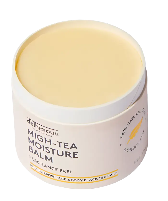 The Delhicious Migh-Tea Moisturise Multipurpose Balm Fragrance Free is specially developed for the most sensitive skin. This fragrance-free version of the award-winning balm offers immediate and long-lasting relief for dry, tight skin – ideal for both face and body. Caffeine from black Assam tea helps soothe redness and irritation effectively. The balm melts beautifully into the skin, leaving it soft, supple and nourished.