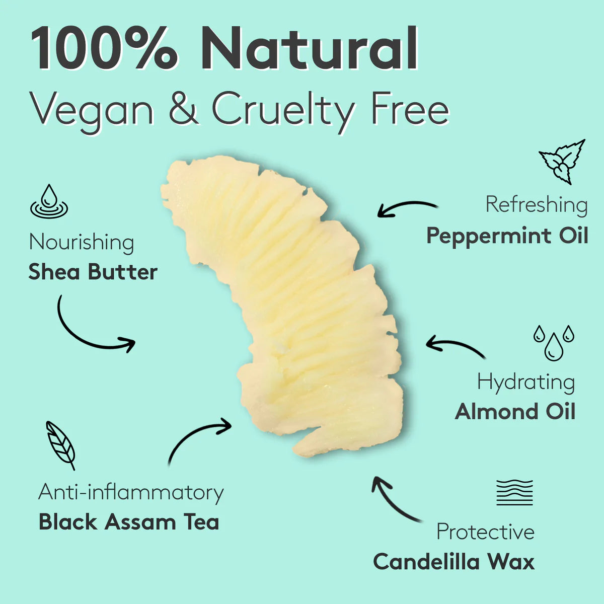 Butyrospermum Parkii (Shea) Butter, Prunus Amygdalus Dulcis (Sweet Almond) Oil, Candelilla Cera (Candelilla Wax), Camellia Sinensis Leaf (Black Assam Tea), Mentha Piperita (Peppermint) Oil, Limonene, Linalool, Citronellol.
