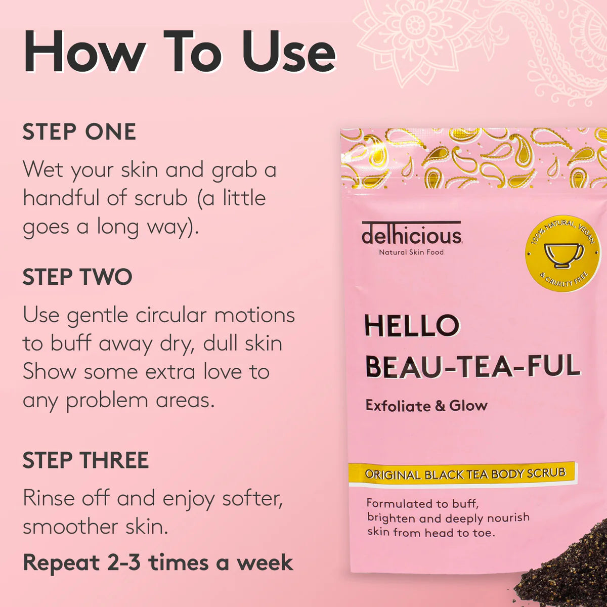 The Delhicious Original Black Tea Body Scrub is your go-to for dry, dull skin and strawberry skin! This intensively exfoliating scrub is packed with caffeine and antioxidants from Indian Black Assam Tea, removing dead skin cells gently yet effectively. After just one use, your skin feels softer, smoother, and more refreshed.