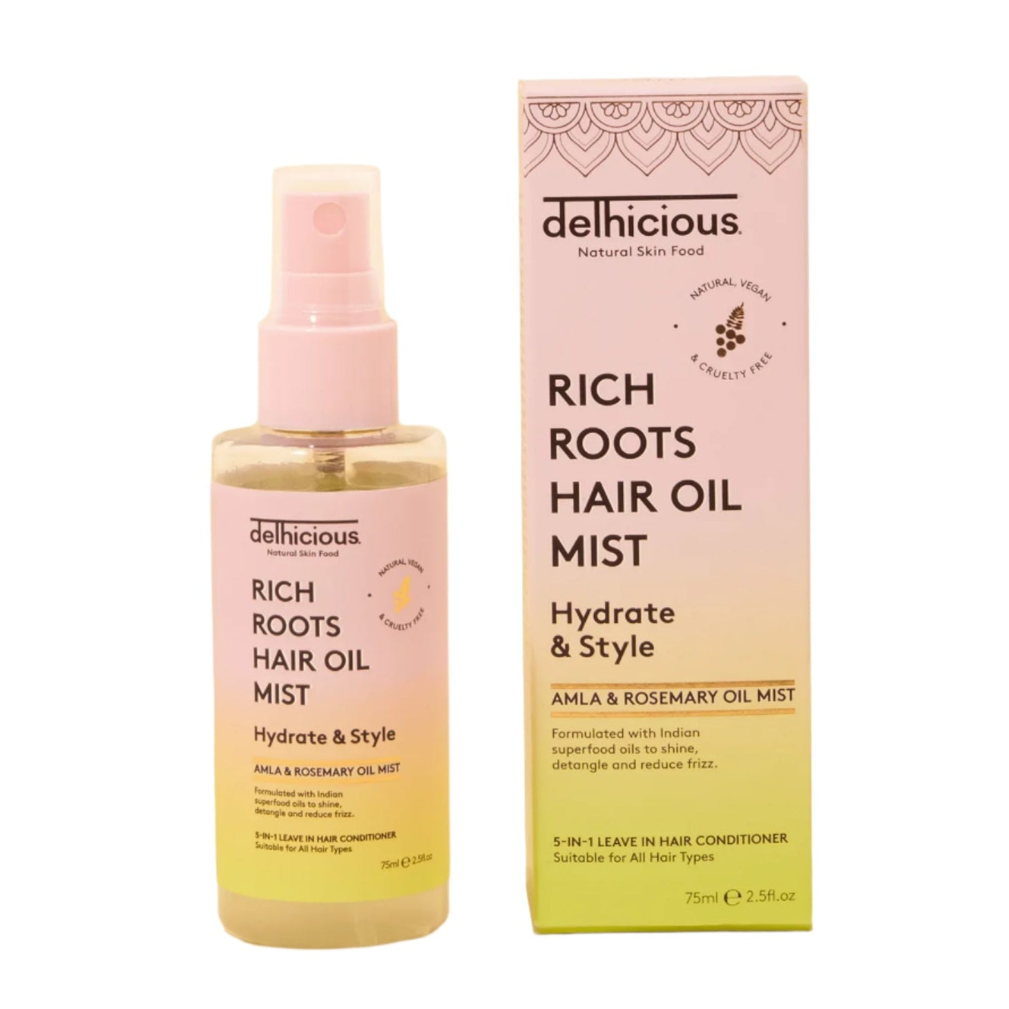 The Delhicious Rich Roots 5-in-1 Hair Oil Mist Leave-In Conditioner is the ultimate multitasker for your hair! This lightweight mist nourishes, smooths, detangles, tames frizz, and adds a healthy shine – all in one spray. The unique formula combines rose water, Indian amla, rosemary, argan oil, and bhringraj to deeply hydrate and strengthen your hair.