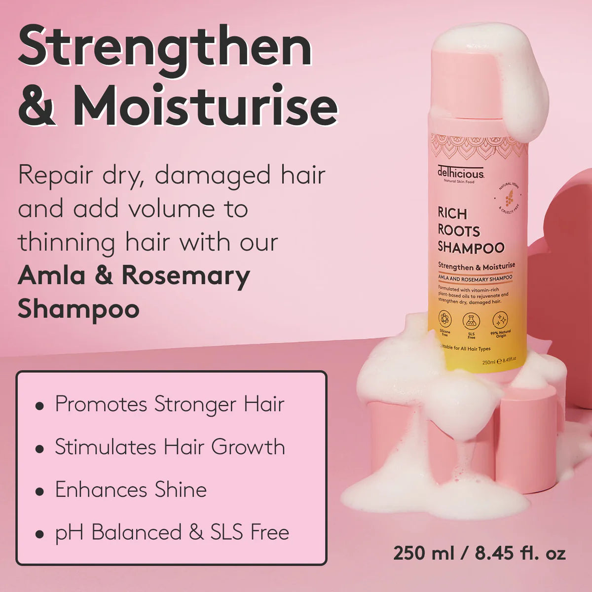 The Delhicious Rich Roots Strengthen & Moisturise Shampoo with Amla & Rosemary is a true gamechanger for dull, dry and lifeless hair. This gentle shampoo is enriched with powerful Indian superfoods and herbs such as amla berry, shikakai and Indian soapnut. Nourishing oils like argan and rosemary deeply hydrate and strengthen your hair from root to tip.