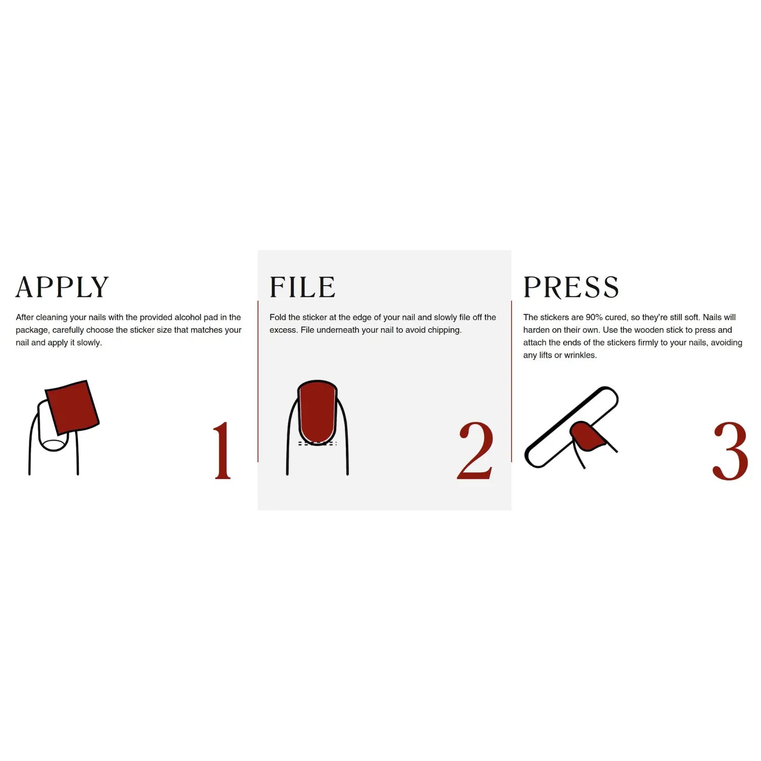- Apply the strips to your nails and press firmly for proper adhesion.
